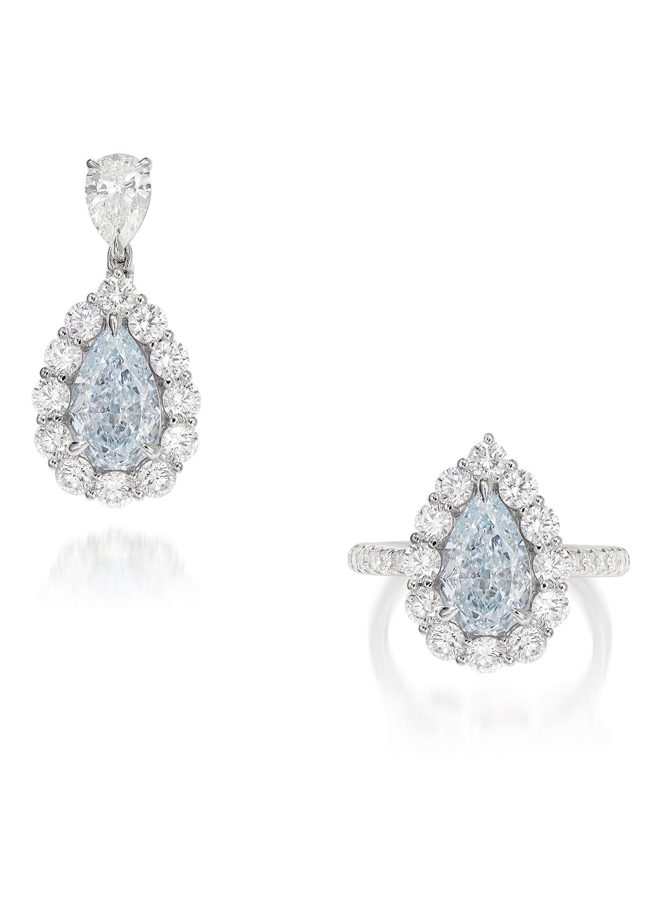 One pear-shaped Fancy Blue diamond, 2.21 caratsOne pear-shaped diamond, 0.60 carat