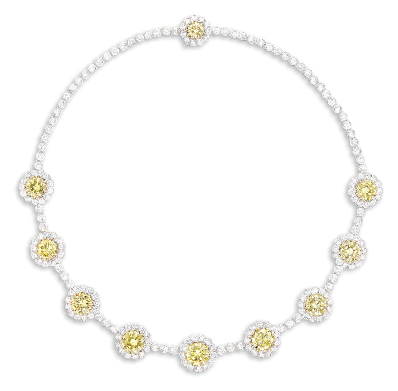 Ten round brilliant-cut Fancy Yellow diamonds, totalling 19.56 caratsEach surrounded and linked by brilliant-cut diamonds, totalling approximately 13.00 carats18 karat white and yellow gold(Ten Yellow Diamonds, ranging from 2.78 to 1.03 carats)