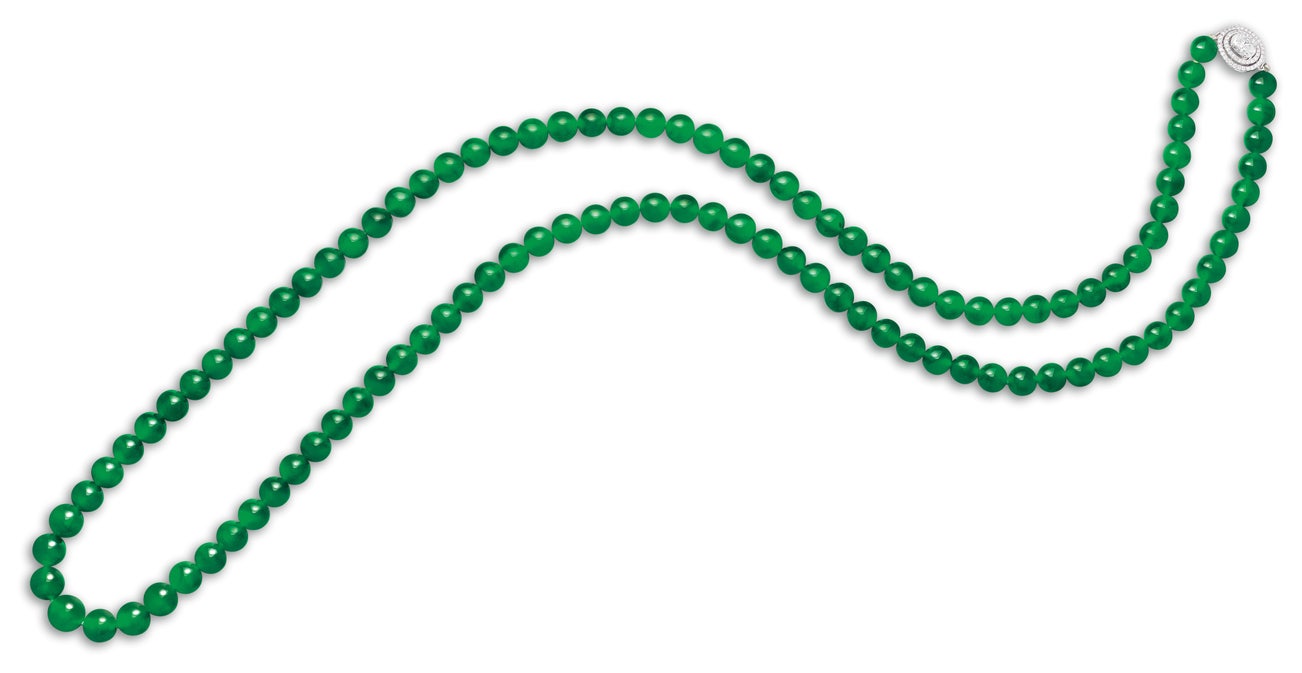 A fine jadeite bead necklace has always been considered one of the most classic and rarest connoisseur jewellery items. To assemble a considerable number of jadeite beads, a huge jadeite boulder is required to provide enough quality beads for selection. On average, two-third of theses beads are rejected in the process, so only beads of the best matching colour and translucency are chosen. This very necklace is a fine example resulting from such a highly selective procedure. It is composed of 108 jadeite beads of superb quality, carefully selected from a pool of 500 beads originating from a boulder that weighed almost 5 kilograms. Each jadeite bead is scrupulously hand-picked to ensure well-matched colour, texture and translucency.