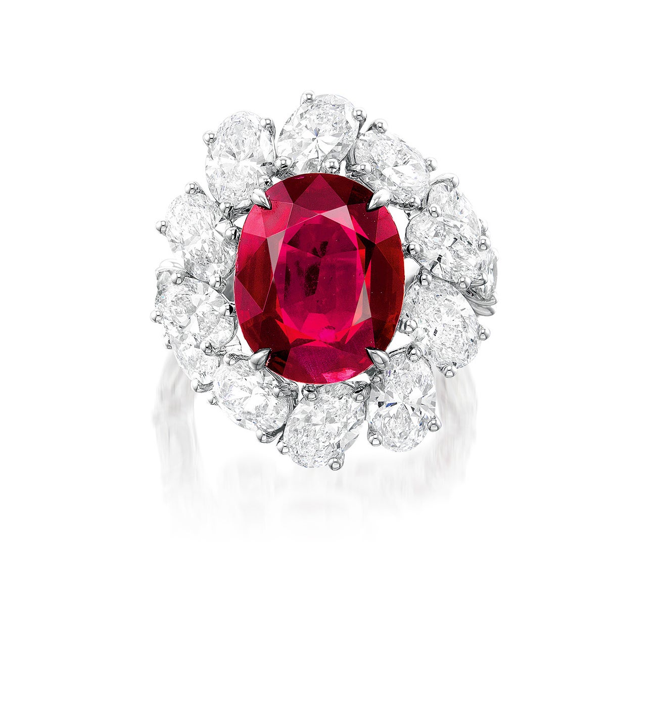 Set with an oval ruby weighing approximately 9.03 carats, within an oval diamond surround, mounted in white gold, size 7¾.