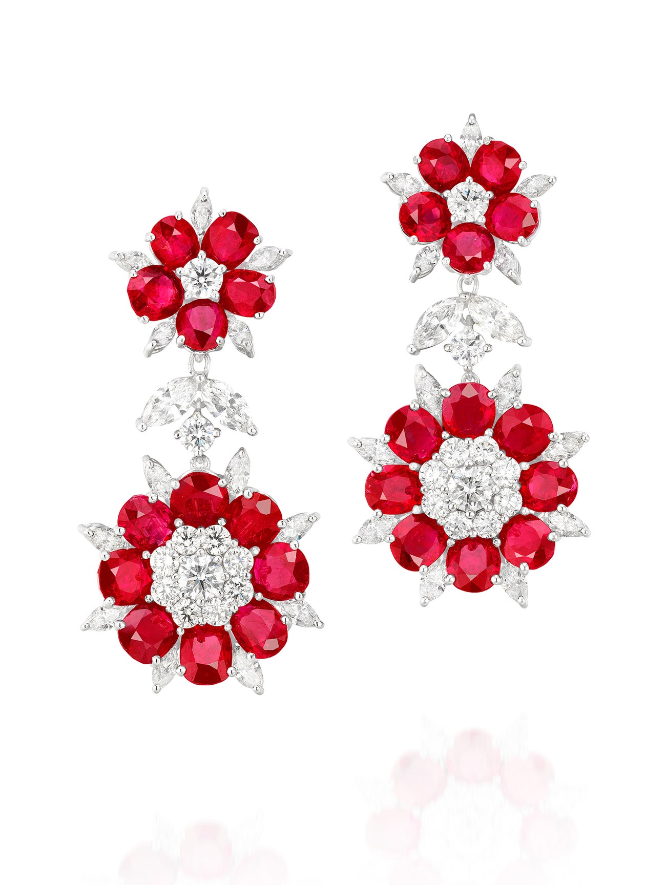Each designed as a ruby and diamond flowerhead, suspended from a marquise-shaped and brilliant-cut diamond foliate spacer, and a similarly-set ruby and diamond top, mounted in white gold, pendants detachable, post and butterfly fittings.