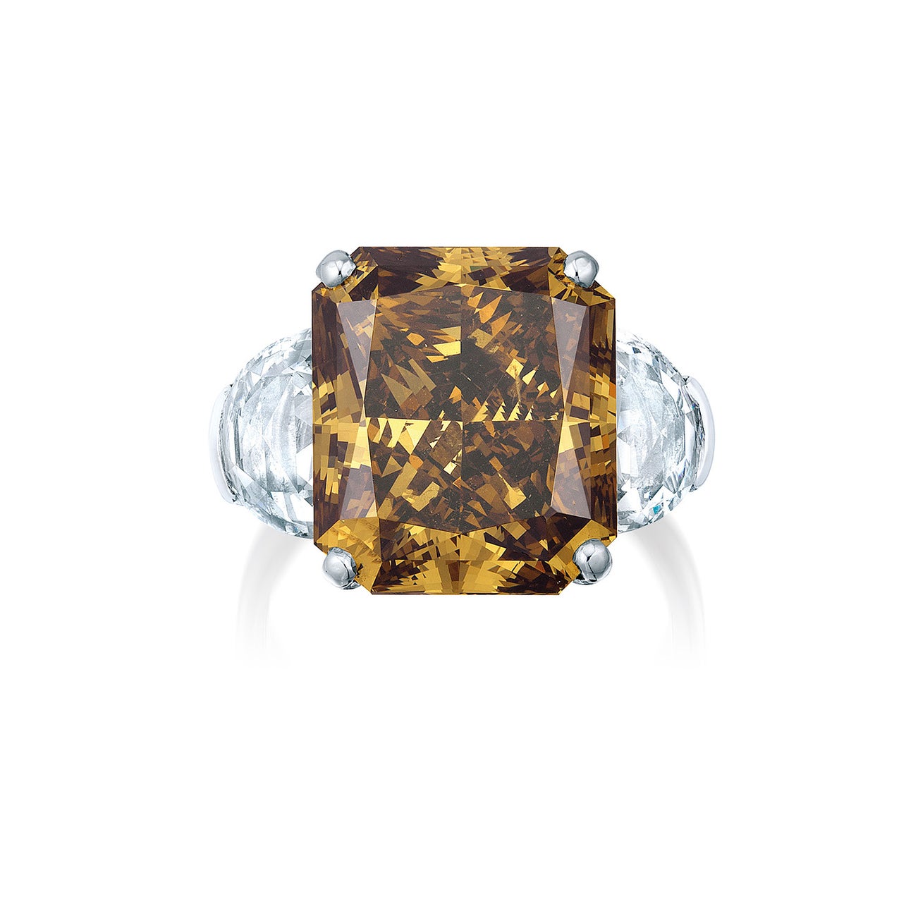 One cut-cornered rectangular-cut Fancy Dark Yellow-Brown diamond, 13.28 caratsTwo half-moon rose-cut diamonds on the sides, 1.80 carats totalPlatinum<em>GIA Report: Fancy Dark Yellow-Brown colour</em>