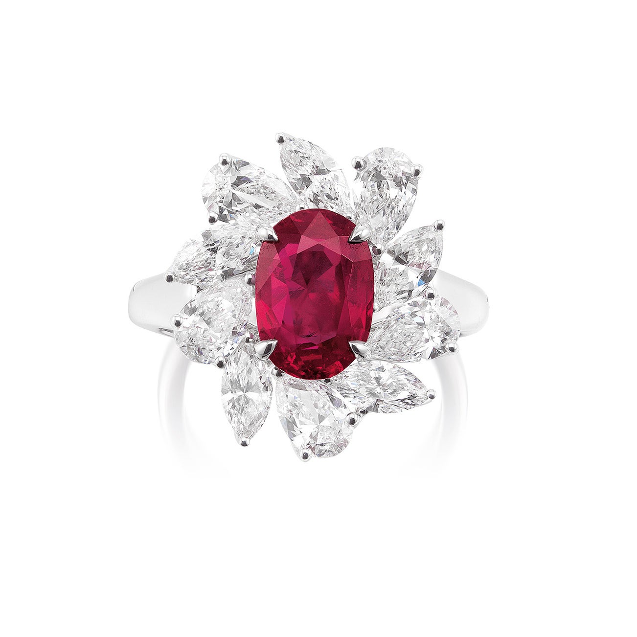 One oval-shaped ruby, 3.02 caratsMarquise-cut and pear-shaped diamond surround, 2.49 carats total18K white goldSigned Serlas Unique<em>GRS Report: Burma, no indication of thermal treatment, ‘Pigeon’s Blood’ red colour</em>