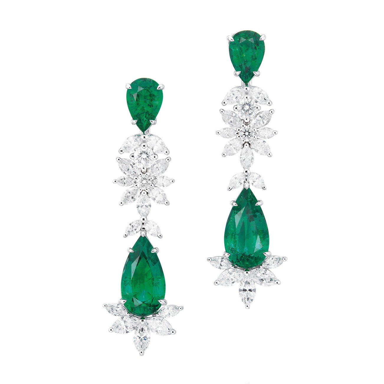 Four pear-shaped emeralds, 12.47 carats totalThirty-two marquise and fifty-four brilliant-cut diamonds, 4.90 carats total18K white goldSigned Hermitage<em>GRS Report: Zambia, with gemological evidence of insignificant to minor clarity enhancement</em>