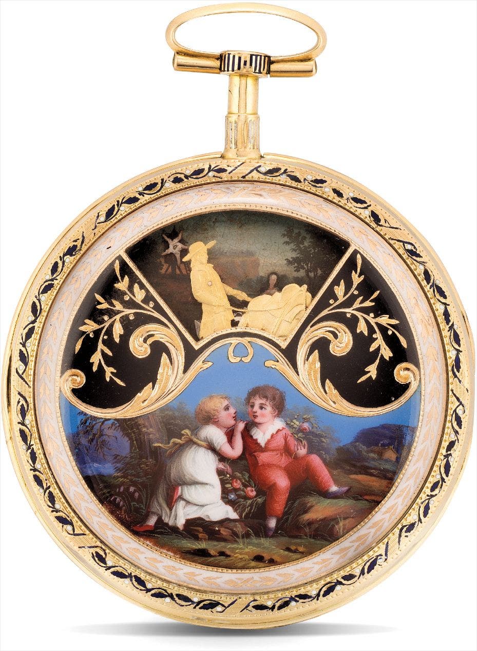 On the reverse of the present watch, we are presented with a five motion automata. The gold figures revolve and a gentleman removes his hat while bowing, a second man is then taking a drink from his bottle and finally a horseman is striking his horse. Behind them, we have running water and a working windmill.