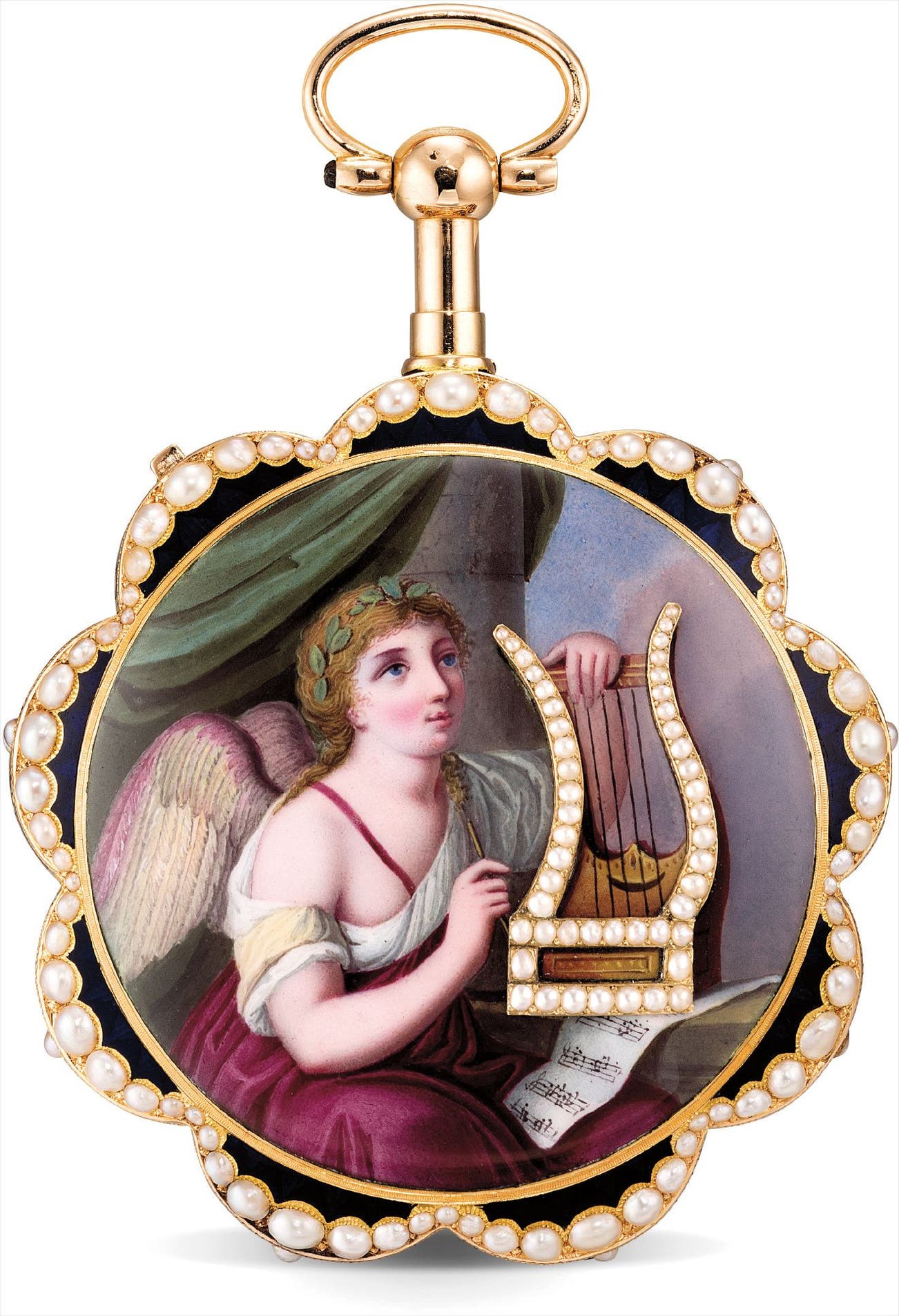 Museum quality is the only fair assessment one can use to describe this lavishly decorated, yet complicated watch. The superb quality of the scalloped case, pearl setting and the spectacular craftsmanship of the enamel decoration illustrates perfectly some of Geneva’s most talented case makers and enamellists of the late 18th and early 19th century. The movement has been preserved in exceptional condition further distinguishing this outstanding enamel.