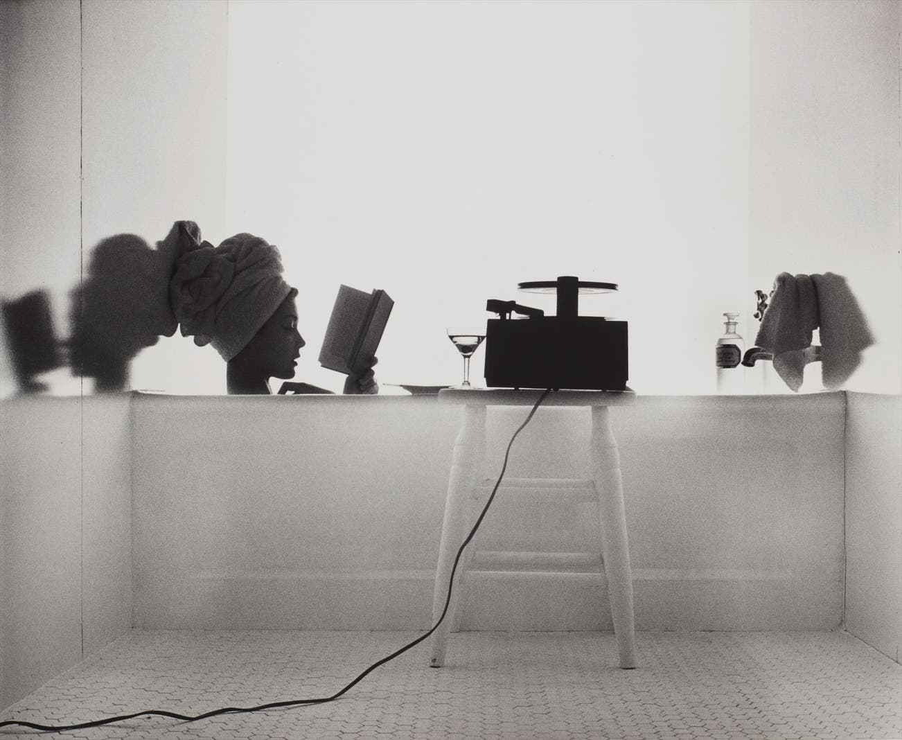 Irving Penn is known for his use of light and his stark simplicity. For the current lot, Jean Patchett is backlit as she lies in a white bath, which is level with a white stool and set within white walls and white tiled floors. The gramophone, the tap with washcloth, the drink, the book, and the model herself are silhouetted against the light streaming out from behind, creating a serene, elegant ambience and an ideal bathing experience. The simple lines against the gleaming white highlight the details of the scene: her hand at her clavicle and her reflection against the wall, the cord of the gramophone as it snakes its way across the floor, and the light coming through the translucent soap bottle. Printed shortly after the negative date in an edition of six, this is the first time a print from the edition has appeared at auction.