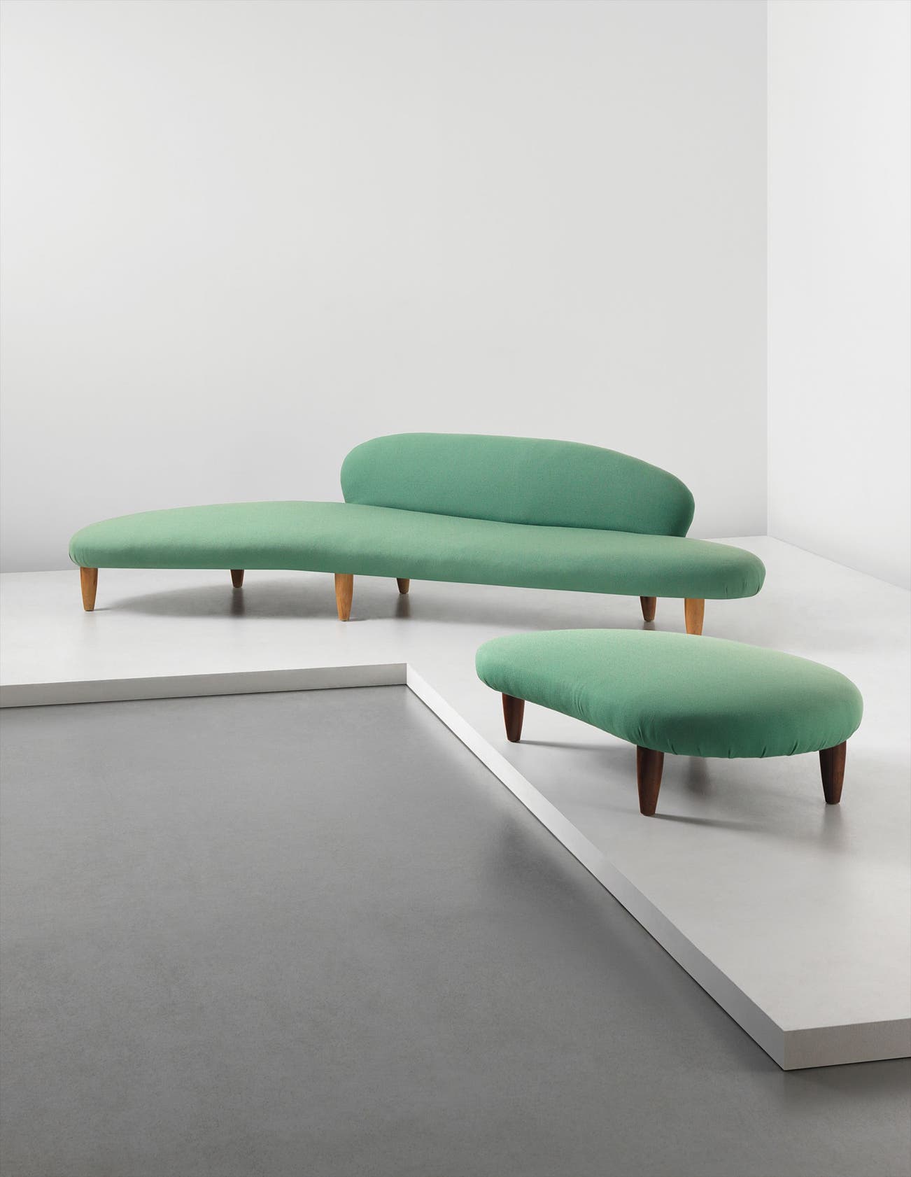 Mirroring the organic forms of Noguchi’s sculptures and installations of the same period, the present “Cloud” sofa and ottoman embody the biomorphism Noguchi sought to express in his work. George Nelson, then Creative Director of The Herman Miller Furniture Company, described Noguchi’s “Cloud” designs as “neither homey like the handicraft object nor rigid like the machine form – but amorphous and flowing like living tissue.” The “Cloud” sofa and ottoman appeared in Architectural Forum (April 1949) as Noguchi’s ideal concept for furniture design: “It should be, he says, ‘a soft rock.’” Although Interiors (March 1949) gave it qualified praise—“screwballish to some, of extraordinary plastic beauty to others”—the “Cloud” became an iconic example of the sculptural design of the late 1940s. Despite the many press mentions received, however, it was never published in Herman Miller’s catalogues, nor mass-produced; the “Cloud” was made-to-order between 1949 and 1951.