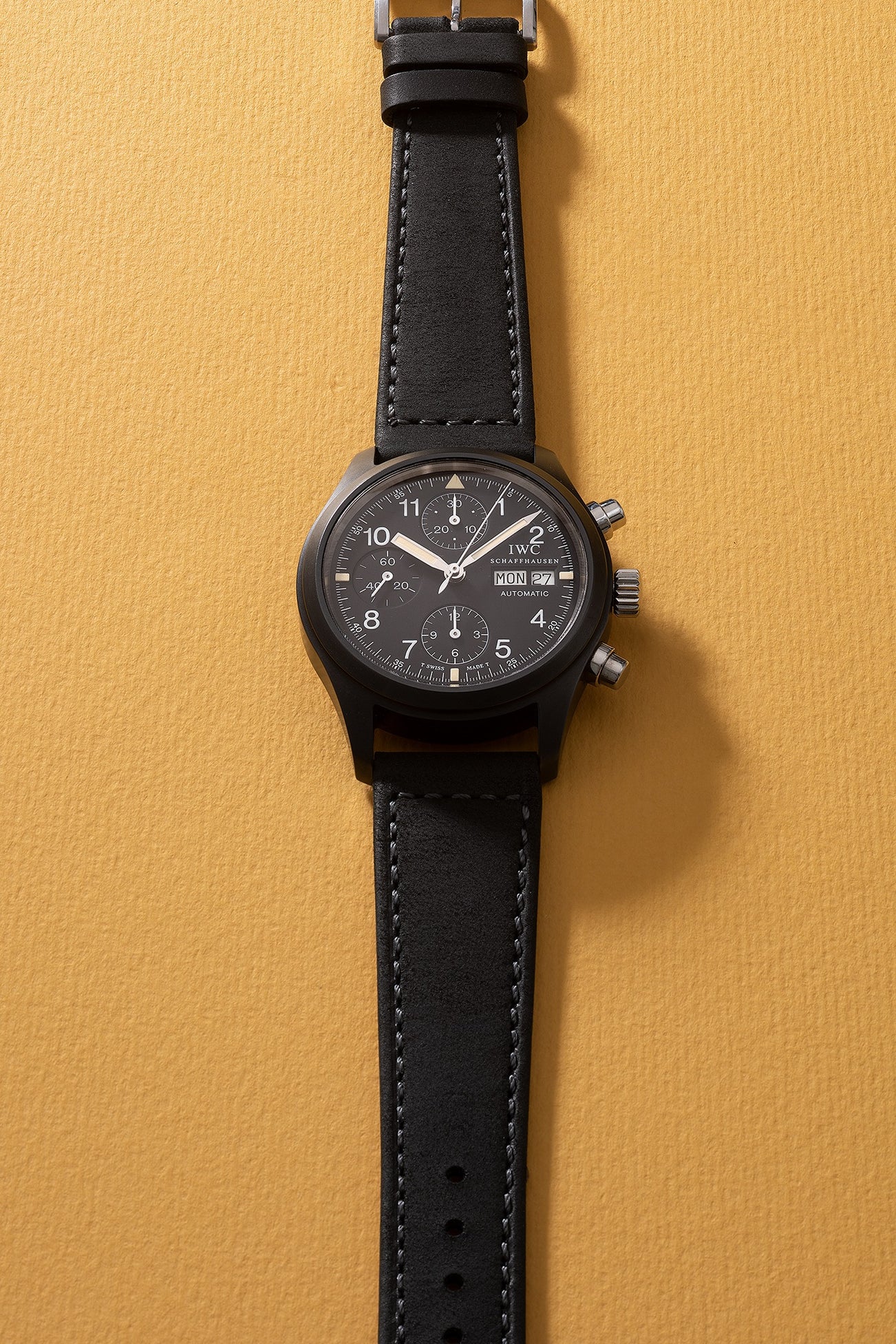 The pilot’s chronograph is a rare modern classic that was introduced in 1994 and remained in production only until 1998. According to research performed by Phillips and IWC, only 999 ceramic examples were made, with a larger production number for the reference 3706, the stainless steel model. The reference 3705 has an appeal of machismo and stylish flair with its dark ceramic case — a fully compressed, molded ceramic, not just a surface coating.