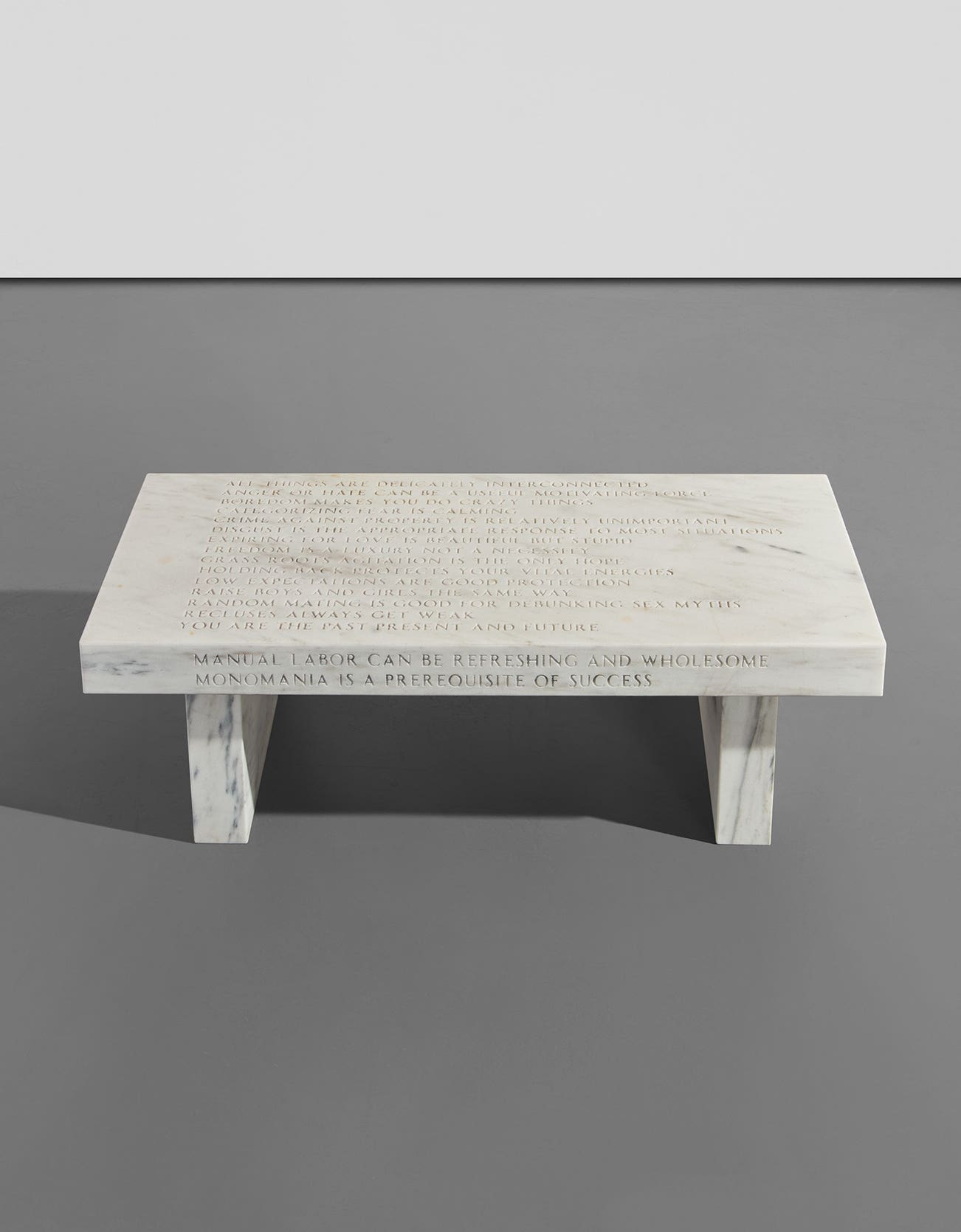 Holzer’s stone benches are at once intimidatingly stoic, while also readily welcoming. The present lot features a selection of Truisms that cover the entirety of the object allowing viewers to meander around and absorb the piece in its unique totality. Holzer imbues equal significance with her chosen media as she does with her content. The sleek marble of the present lot resembles a commemorative monument, and thus lends her engraved words a particular gravitas.