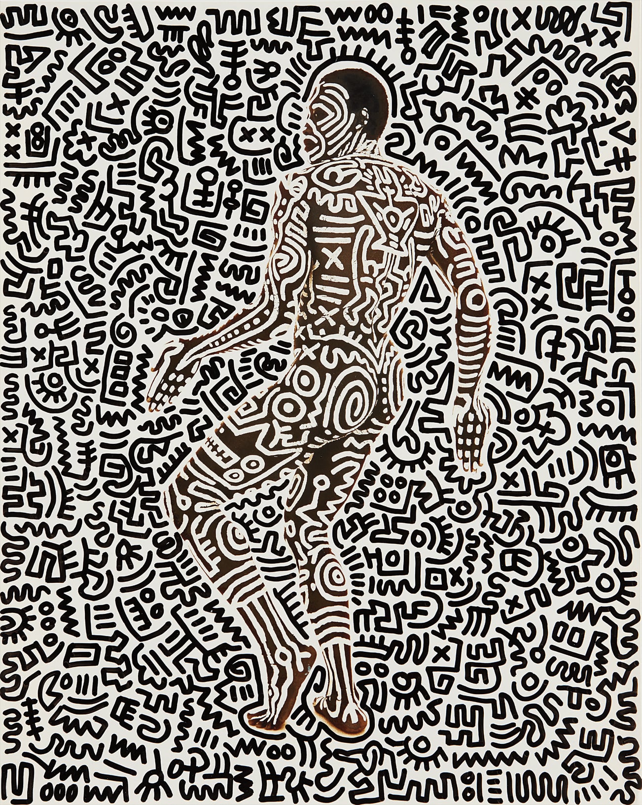 For this series Haring borrowed Jones’ body - from head to toe - as the canvas to his work. At the end of a process lasting over fours hours the choreographer found himself all covered in white acrylic paint with the characteristic bold pictograms wich represent Haring’s own artistic signature. Next, Tseng Kwong Chi photographed Jones performing freely and spontaneously in the studio and the collaboration between the three artists resulted in the production of black and white photographs which are nothing less than pure artistic magic. Herein, to further imprint his own seal, Haring expanded the black graffiti-like pattern to the white background so that Jones’ sinuous body becomes hardly discernible.