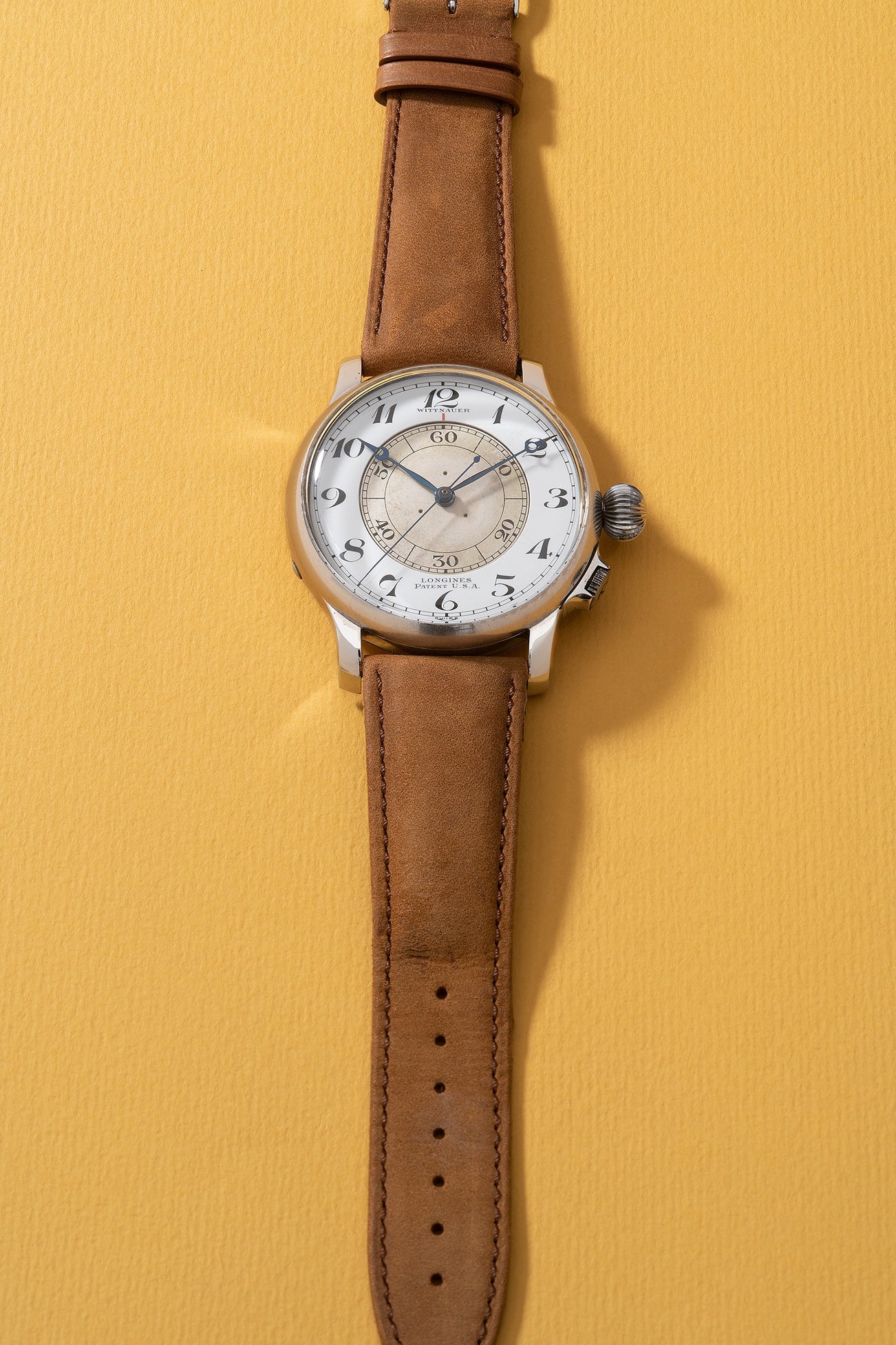 The present Weems Second Setting watch is possibly the one of the earliest examples to have ever appeared at auction. According to the archival information from Longines, the watch was sold on April 26, 1940 to Longines-Wittnauer, the Longines USA agent at the time, in accordance with the ‘LXW’ import code found on the movement. The oversized 47-mm case is in great condition. Fully embodying all the appeal and thrill a pilot’s wristwatch stimulates in the heart of collectors, this Weems Second Setting presents one of the earliest and intriguing aviation timepiece at auction.