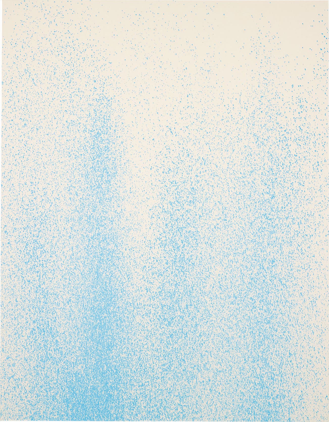 Using an old-fashioned fire extinguisher filled with paint, he sprays drops of light blue across white canvas. Reminiscent of a rainy day, the optic play of light blue pigment on the flawlessly raw background results in a quiet sense of meditation. The current work also demonstrates the artist’s continuous efforts to achieve perfect droplets and to reach the most appropriate angle and distance. By revealing his physical gestures to achieve the most “spontaneous” expression, he examines the proximity between the artist and his production. Smith points out that an artist’s trajectory is a sensory reflection of individual experience. Lucien Smith’s work traverses a spectrum of styles and concepts, from chance to purpose, spare to saturated, unknown to familiar. It acts as a tangible moment in his exploration and negotiation with nature and existence.