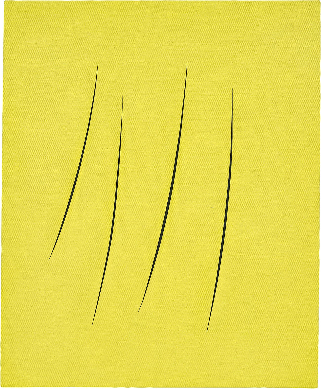 signed, titled and inscribed 'l.fontana "Concetto spaziale "ATTESE" 1 + 1 - Mi piace Luisella!' on the reverse