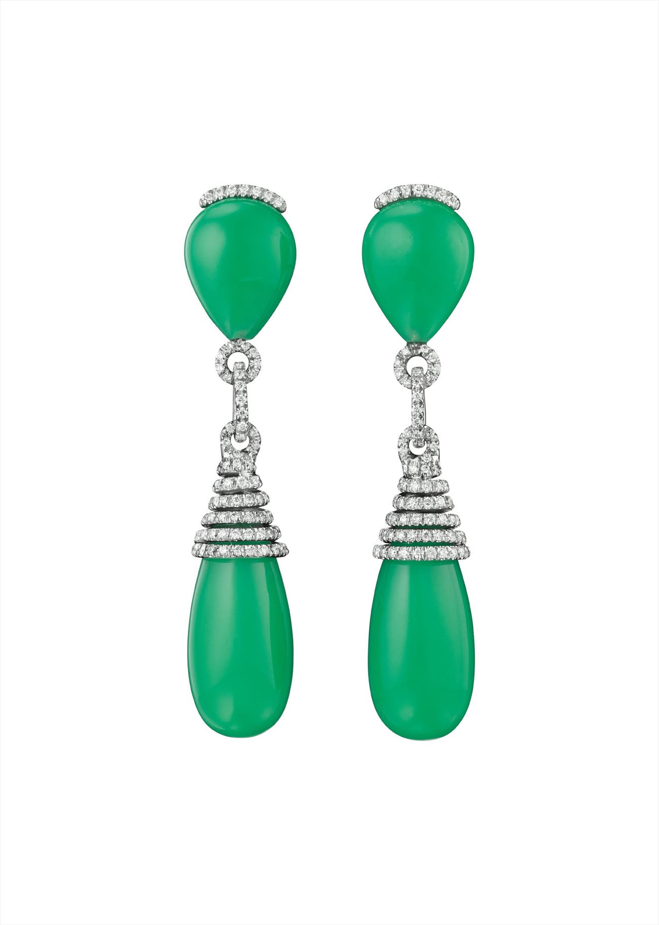 Each designed as a chrysoprase drop, from a pavé-set diamond cap and link, to a pear-shaped cabochon chrysoprase surmount, mounted in 18K white gold, length 2 3/8 inches.