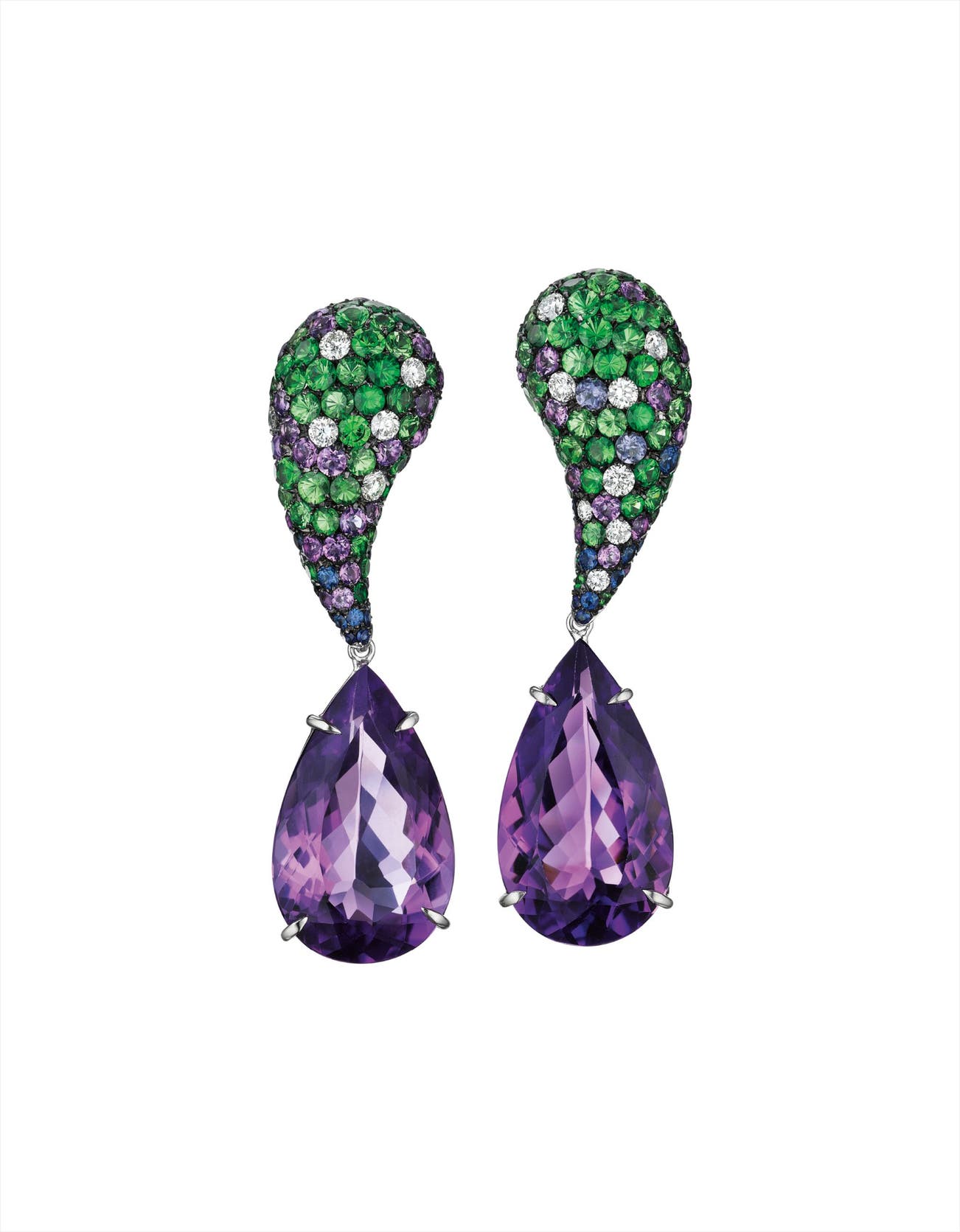 Each suspending a detachable pear-shape amethyst weighing approximately 25.36 carats in total, to the tear-drop shape surmount enhanced by pavé-set tzavorite garnets, diamonds, sapphires, and amethysts, mounted in 18K white gold, length 2 inches.