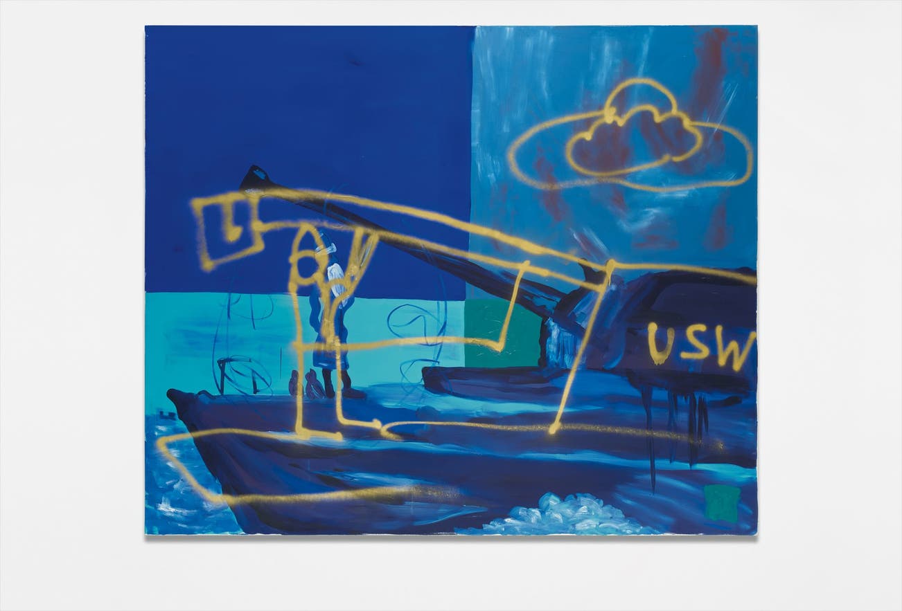 Yet the figural richness inherent is the greatest attraction in Kippenberger’s canvas. Two distinct sets of figures are present: one painted in the blue shades of the background, and the other an electric sprawl of bright yellow spray paint, almost as if Kippenberger wanted to prove to us that he wasn’t afraid to deface his own work. The layer of blue figurines exhibits a familiar scene in Kippenberger’s work: a gnome figure stands atop the front of a cartoonish tank, raising his hand as if to support or otherwise push the gun barrel away from its intended target. Dwarfed atop the enormous war machine, the dwarf’s age and beard closely resemble traditional dress of Eastern countries, as if Kippenberger were trying to tell us that the grudges of the past have begotten the war of the present. It is almost as if the entire scene were taking place on a moonlit sea, the metaphorical implications of war a remote battle from our own perspective. To the left and right of the lone figure, faint sketches of a darker shade seem to hint at movement, the gnome moving stealthily amidst the night.But while Kippenberger’s background picture is richer in figure, his foreground is where the greater part of his artistic innovation occurs. With an almost vandalistic hand, Kippenberger scrawls a new gun barrel atop his tank, complete with the gnome’s ghostly figure pushing it up. He also adds two hitherto unforeseen details to his painting’s narrative: the acronym ‘USW’ (ETC in German) and an alien flying saucer above. While we could search for direct correlative meanings to these additions, it is more than likely that Kippenberger is exercising his modifications in a spirit of enfant terribles-esque mischief, his own canvas a fertile battleground for his continuing whimsical expression.