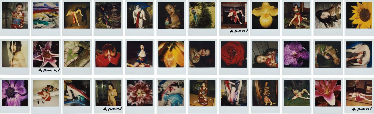The Polaroid camera is one of the many tools Araki uses to sustain his prolific output. Throughout his unrivalled six-decade-long career, Araki, who will be 78 in May this year, has documented the people, events and sights that move him. He is constantly in the act of image-making and re-examining what it means to take photographs. Each taken with a Polaroid 600 camera, the present lot features 36 unique Polaroids of nudes, bondage and flowers, and together celebrate Araki's distinctive eroticism.