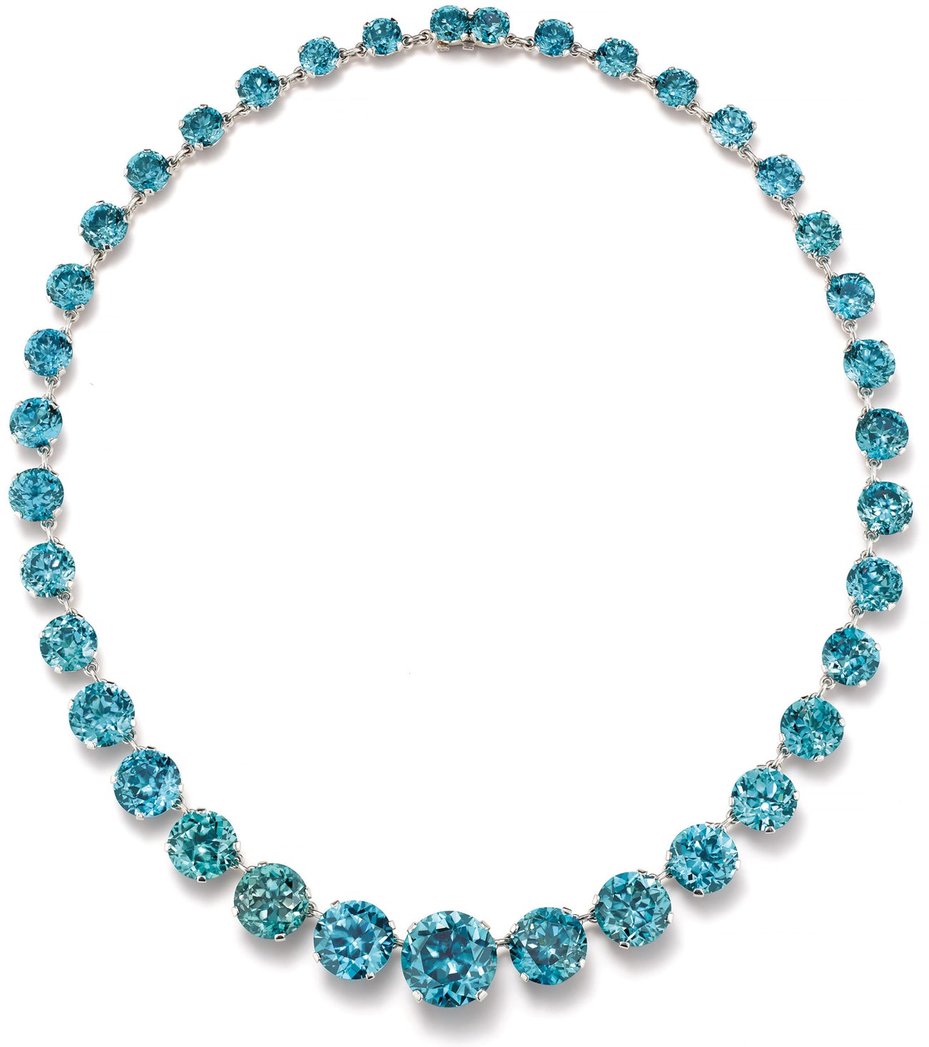 Lot 188 is a brilliant and well-matched electric blue zircon riviera necklace comprised of 37 stones, totaling over 160 carats. As plentiful as zircon is, its availability in large crystals is uncommon, making the center stone of 18.94 carats, with its high clarity and alluring shade of blue a rare and lovely example of the mineral.