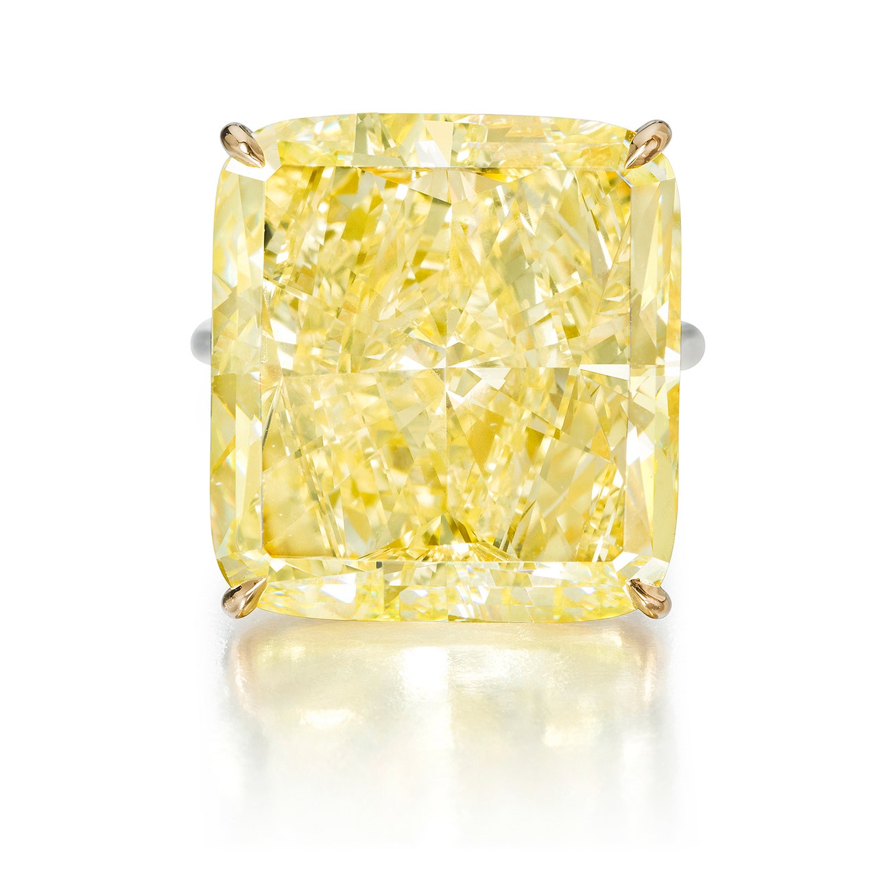 Set with a rounded-cornered rectangular modified brilliant-cut fancy intense yellow diamond weighing 30.65 carats, mounted in platinum and yellow gold, size 6.