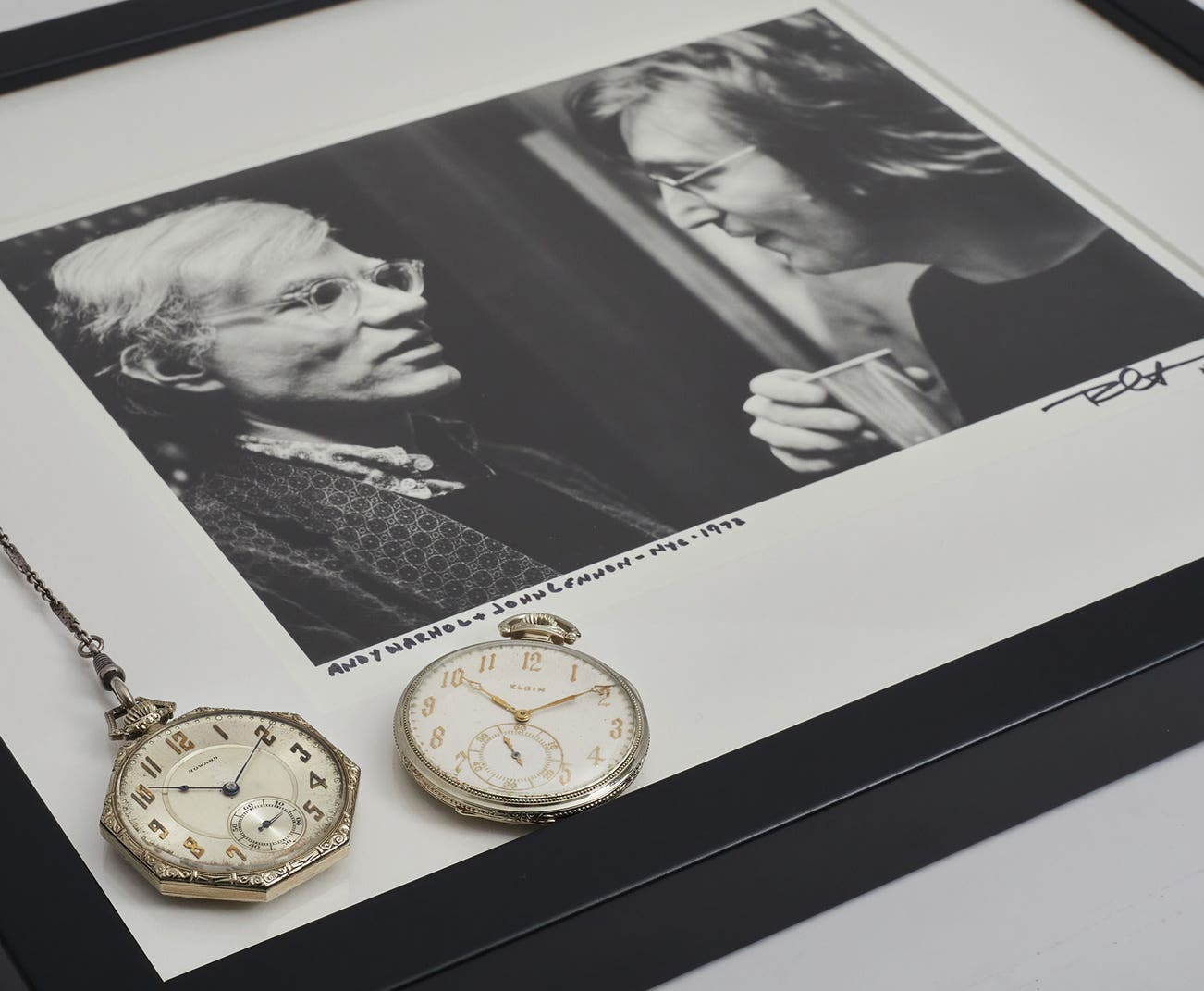 in music and art. Two titans of 20th century cultural history, John Lennon and Andy Warhol, were at very the top of their respective fields. They would become close friends, spending considerable time together in New York City throughout the 1970s. They were captured together, meeting on April 13, 1972 at the Record Plant in New York City. Photographed by one of the great documentarians of rock ‘n’ roll history, Bob Gruen, this image would captivate the consignor of the present lot, inspiring him to track down and unite these two pocket watches, now being offered together as one lot - a fitting tribute to these two iconic figures.