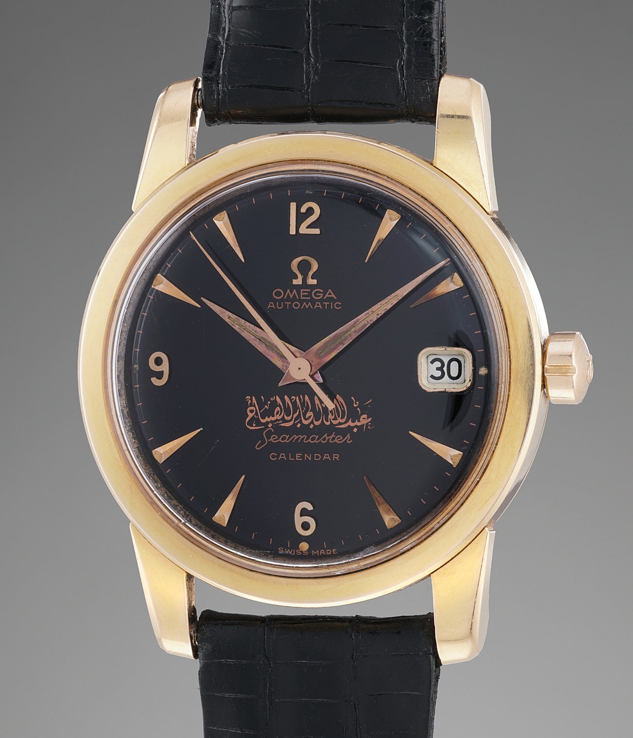 A fine and rare pink gold wristwatch with black glossy dial and bearing the signature of Sheikh Abdullah Al-Jaber Al-Sabah of Kuwait