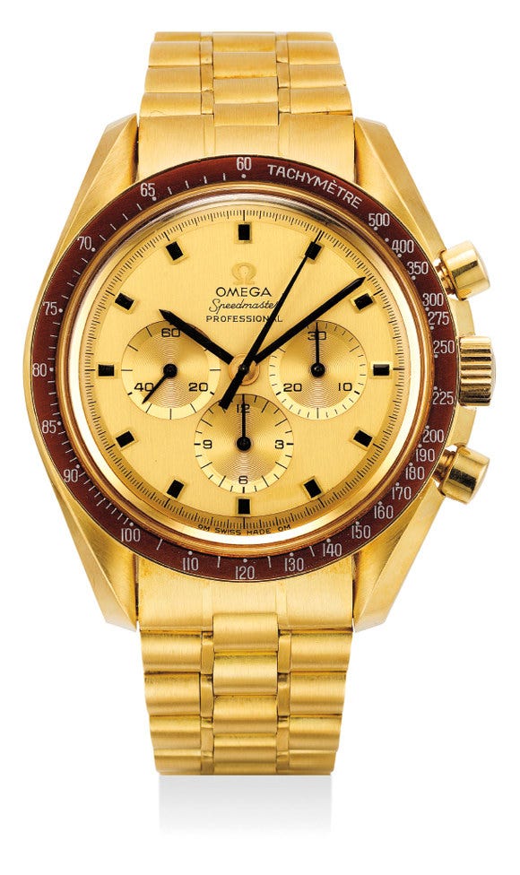 As a matter of fact, the series features an evolution of case and dial. Three variation of the case back are recognized: early examples (circa the first 100 pieces) feature a thin unpainted engraving, then comes a thick unpainted engraving (exemplified by the present watch) and finally we have the burgundy-painted engraving. Dial-wise, instead, one can identify early dials most easily distinguishable by the O in "Omega" having an oval design, and later dials with round O.
