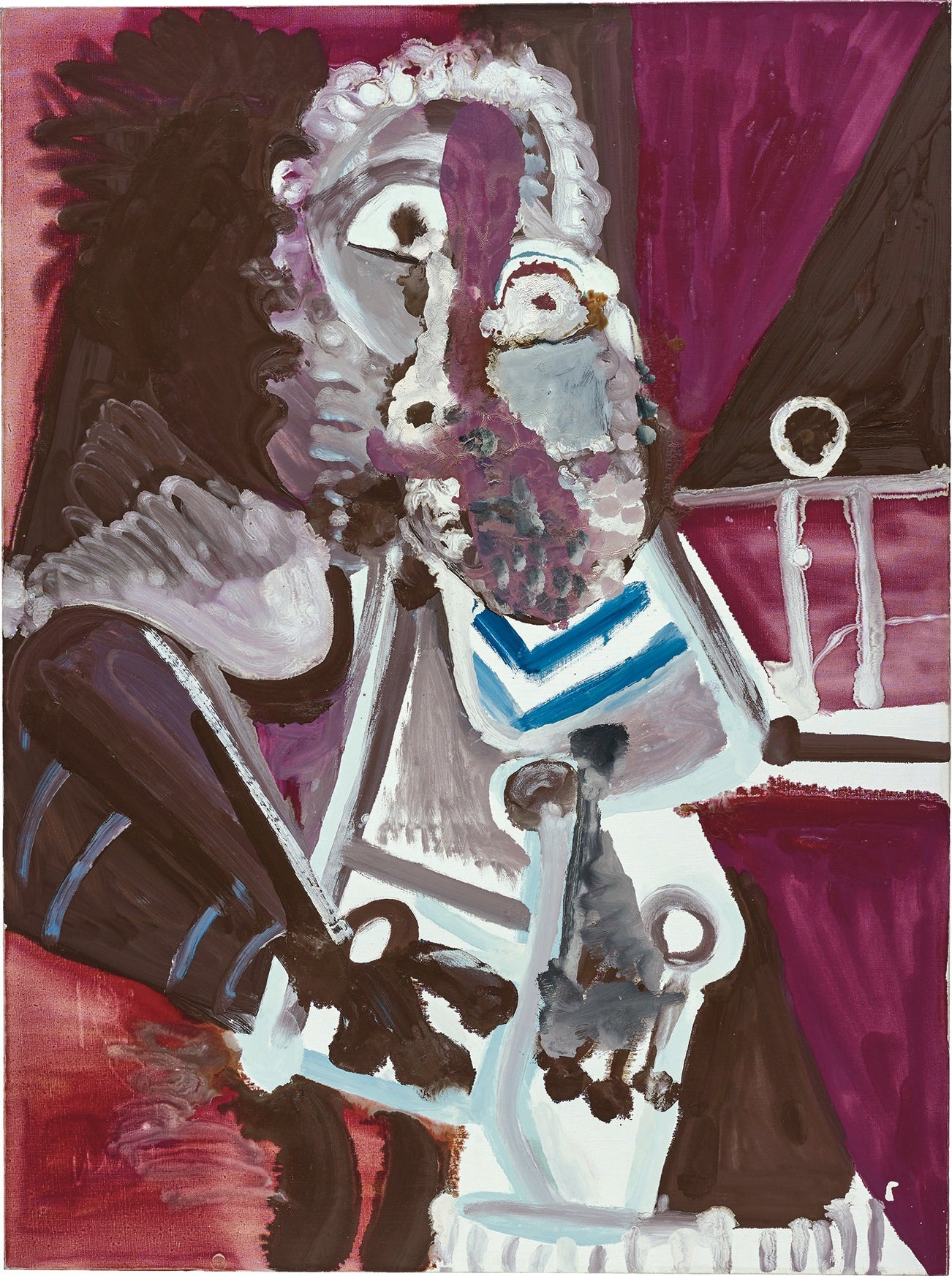 The great Old Masters were Picasso’s artistic companions and comrades—all the more so as he had outlived so many of his own contemporaries. By the time Homme assis (Mardi gras) was painted, his great friend and rival Henri Matisse had been dead for almost two decades. More recently, other friends such as Georges Braque, André Breton, Jean Cocteau and his old poet and secretary Jaime Sabartés had all died. Picasso, an artist with a notorious and even superstitious fear of death, was left fighting the rearguard action. It was this painful awareness of his own limitations and indeed his mortality that appears to have been the greatest spur to the creative drive that saw Picasso painting some of his most vivid paintings during this period. Looking at Homme assis (Mardi gras), there is an intoxicating immediacy to the brushwork. Some of the texture of the picture is rendered through vigorous squiggles; the hair is a combination of curls and dots that appear to show the artist almost stabbing the canvas. Meanwhile, other lines have been rendered with a balletic grace that belied Picasso’s age. The picture sings of the sheer amount of energy that the artist channelled into the act of its creation. Picasso once said, in words that clearly apply here, that, 'Each picture is a phial filled with my blood' (Pablo Picasso, quoted in Marie-Laure Bernadac, 'Picasso 1953-1972: Painting as Model’, pp. 49-94, Late Picasso: Paintings, sculpture, drawings, prints 1953-1972, exh. cat., London and Paris, 1988, p. 92).