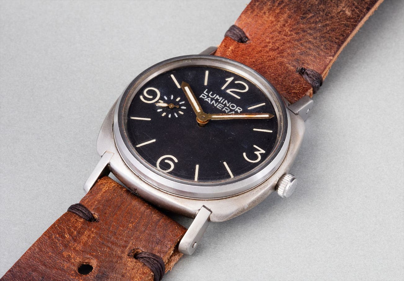 The gray-colored Luminor-style case is extraordinary, with four separate lugs soldered into the case, giving it unique and highly attractive aesthetic amongst all Panerai watches. Fitted with a screw-down Oyster crown, the case was most certainly manufactured by Rolex. It is our belief that this watch was possibly created for presentation purposes, along with another similar example that now resides at the Panerai Museum in Florence, Italy. Besides the present watch and the example owned by the Panerai Museum only three further "Transitional 3646" are known today. With its large diameter case, iconic Luminor Marina sandwich dial, and distinctive prototype case, the present lot offers an extraordinary opportunity for collectors of rare and unusual military watches.
