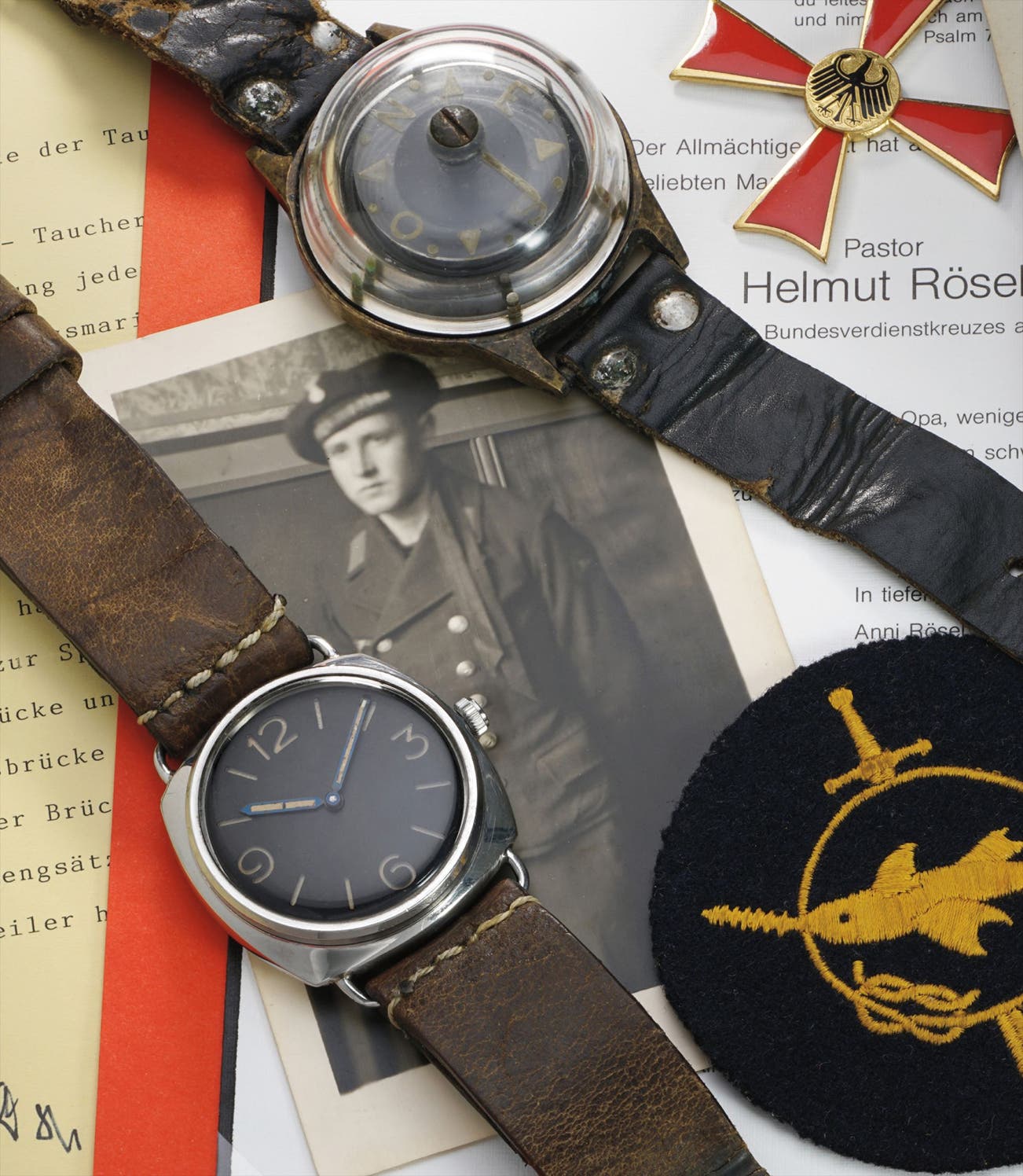 Rösel had donned the present watch while carrying out missions in Duisberg and Wittenberg. In his letter accompanying this watch, he states that every combat swimmer received a diver’s watch after training. Such was Rösel’s competence that he received the “sawfish” badge. An insignia of the special marine unit, it was awarded to volunteer fighters and those who had completed combat swimmer training.