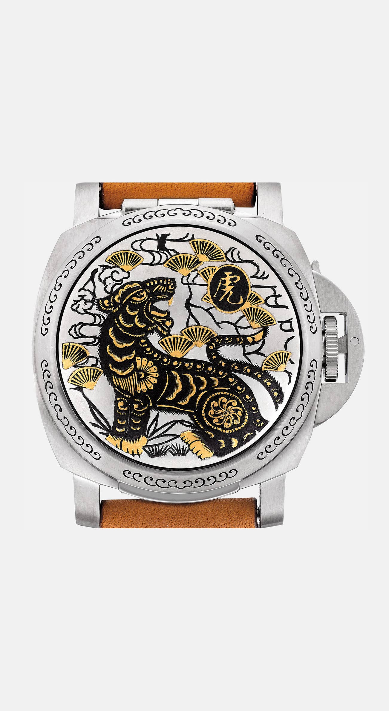 The present watch is number one in the limited edition and is in excellent overall condition. The cushion-shaped case is of typical Panerai form; however, the crystal is covered with a top. The Tiger design is hand carved and highlighted with gold inlaid. The Chinese character 虎 for Tiger is in the top right corner, and the scene is accentuated with fans. The watches were released on February 14th, 2010 the start of the Chinese New Year and sold exclusively through two Panerai stores one in Shanghai and the other in Beijing.