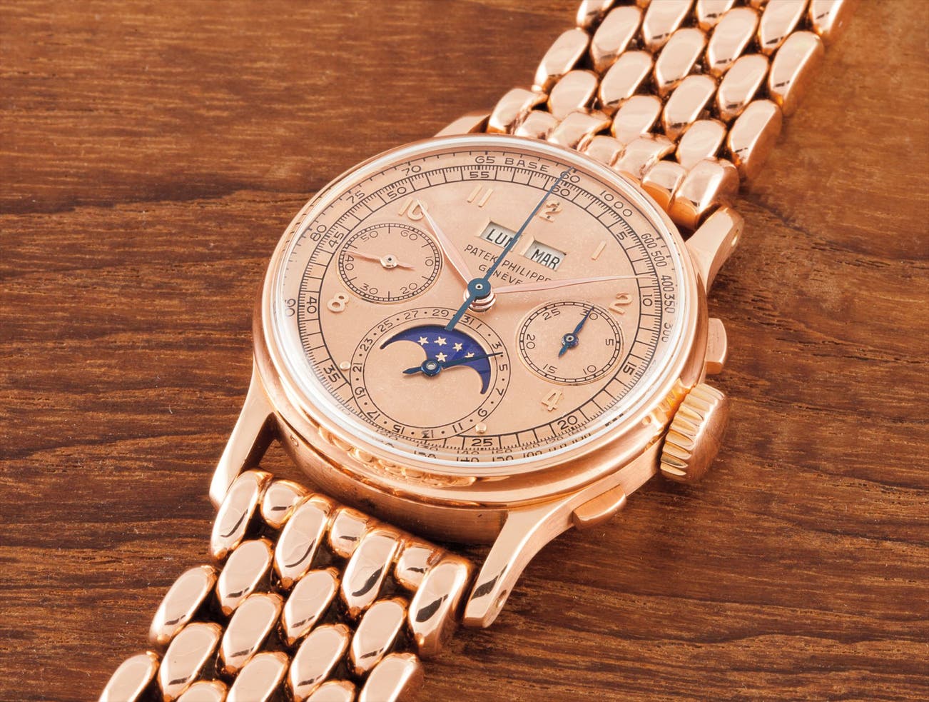 The most breath-taking visual element of this watch is however the massive pink gold Gay Frères bracelet, never seen on any reference 1518 before. A substantial 20 mm wide and over 5 mm thick, it is composed of 7 rows of oversized rice grains. The records of Patek Philippe show that the bracelet was charged to the client at the astonishing amount of 1,000 Swiss francs, nearly as much as the watch itself. The archives of Patek Philippe show that this bracelet was a specific order of the original owner, a prominent French businessman.