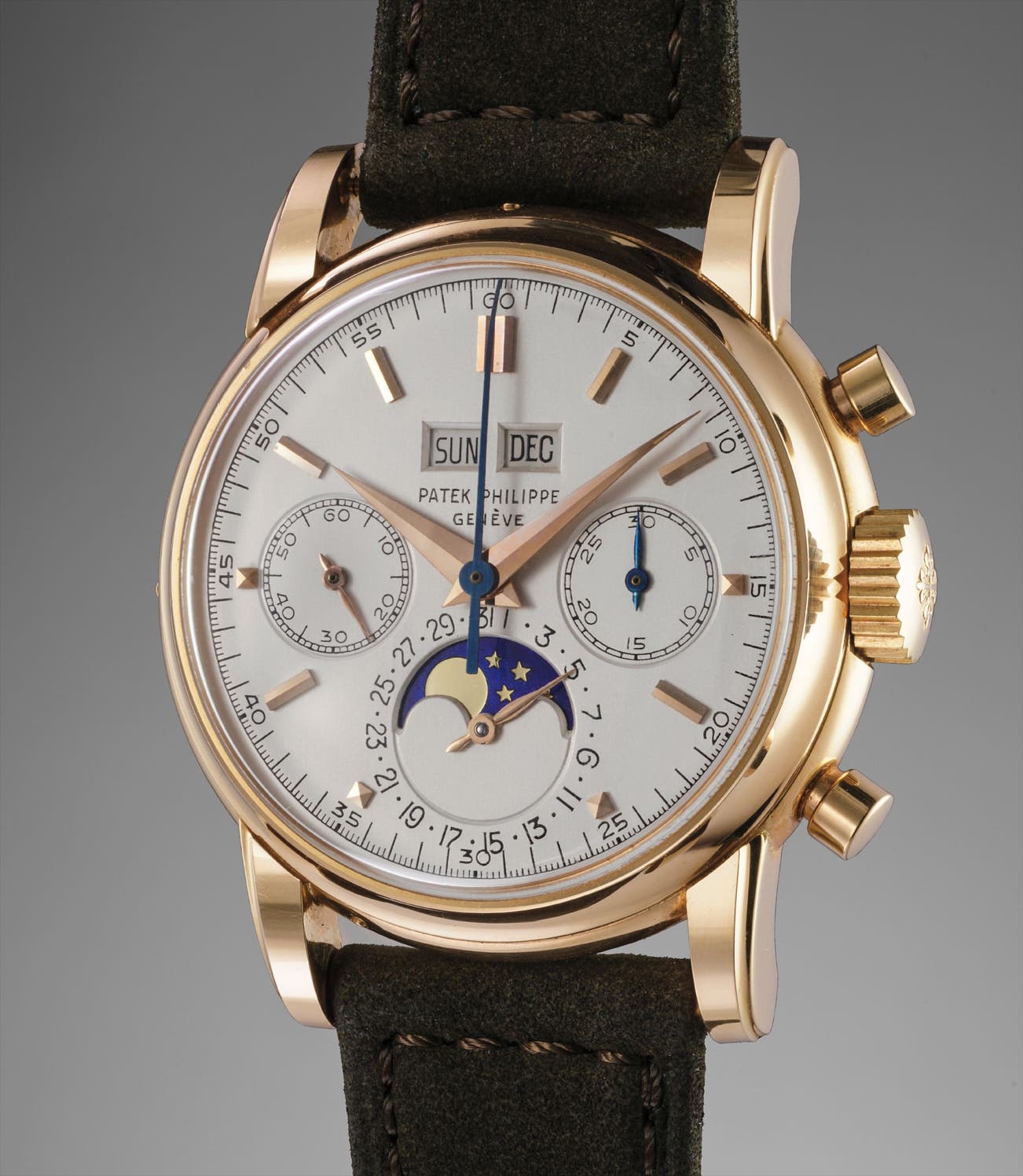 An extremely rare, attractive and exceptionally well preserved pink gold perpetual calendar chronograph wristwatch with moonphases
