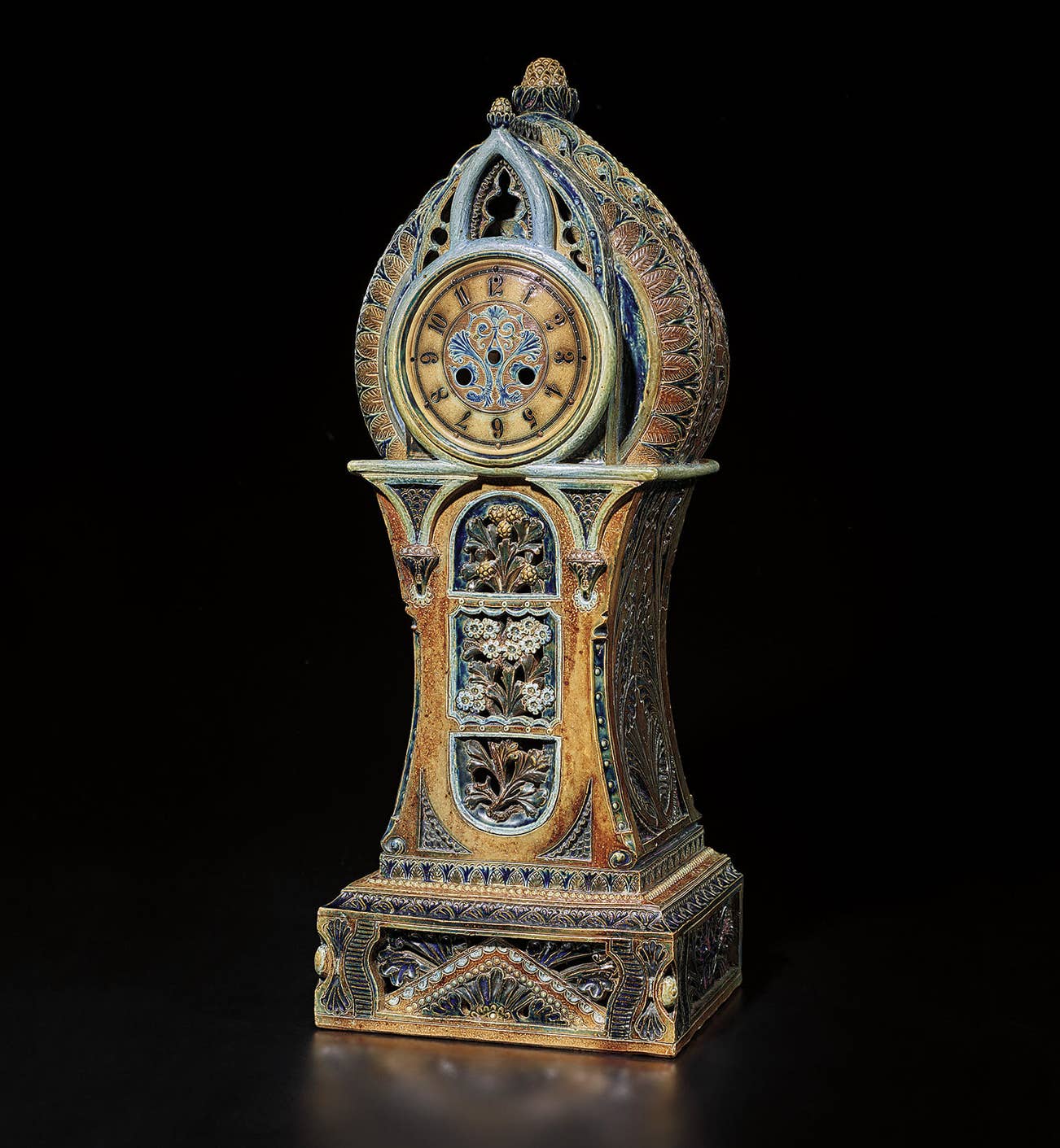The clock case is a transitional piece, at once a proud review and a confident forecast, an important document indeed in the history of the Martin brothers' pottery.