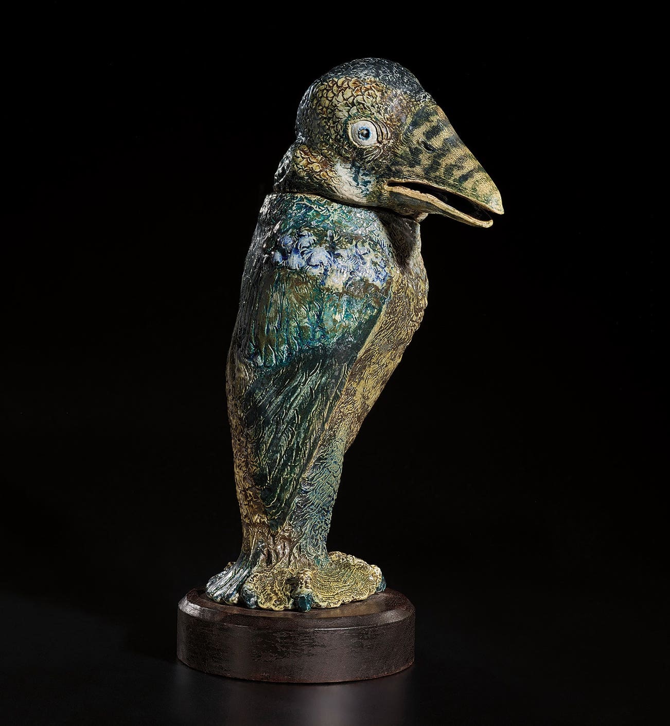 One of the largest "Wally-birds" ever made, this rather meditative example testifies to an unusually flourishing period in the history of the Martin brothers' pottery. A measure of commercial success in the early 1880s gave Robert Wallace Martin the opportunity to develop his grotesques and experiment with tobacco jars in the form of strange—but very human—birds. An account of the Martins' work, written by Holbrook Jackson for T.P's Magazine in 1910, discusses Wallace's bird-jars and proposes humor as their chief motivation and achievement. He comments: "Lewis Carroll and Edward Lear thought along the same lines as Wallace Martin; they dreamed similar dreams, only Wallace Martin has dreamt them in clay." But did Wallace have a hidden agenda? When, as a young assistant, he had worked for the Pre-Raphaelite sculptor Alexander Munro in the early 1860s, he might well have met both Carroll, one of Munro's intimate friends, and Lear who sometimes dropped by the studio. He might too have become aware of, perhaps even browsed through, Thomas Wright's book A History of Caricature and the Grotesque, published in 1865, which contained a lengthy chapter on medieval carvings. It was also in 1865 that Wallace joined the Plymouth Brethren who totally rejected any sort of ecclesiastical organisation. So he would have read with delight Wright's assertion that medieval grotesque art often carried an anti-clerical message, either overt or hidden. "The popular feeling against the clergy," Wright stated, "was strong in the middle ages, and no caricature was received with more fervour than those which expressed the immorality or dishonesty of a monk or a priest." Moreover, at Munro's studio, Wallace would have heard, if he had not already known, about an instance of such lampooning in modern times, for amongst the ornament of the new Oxford Museum (for which Munro made statues of several leading scientists) the stonemason O'Shea had caricatured members of the university Convocation as parrots. Some of Wallace Martin's birds are modeled as tonsured monks, while others caricature pillars of the establishment such as judges or generals. There is, more often than one had perhaps realized, a subversive element in these tobacco jars, an element Wallace would have been loathe to disclose to the mostly middle-class readers of T.P's Magazine. Who knows which parson, magistrate or major-general has been morphed by Wallace into this magnificent, giant bird?