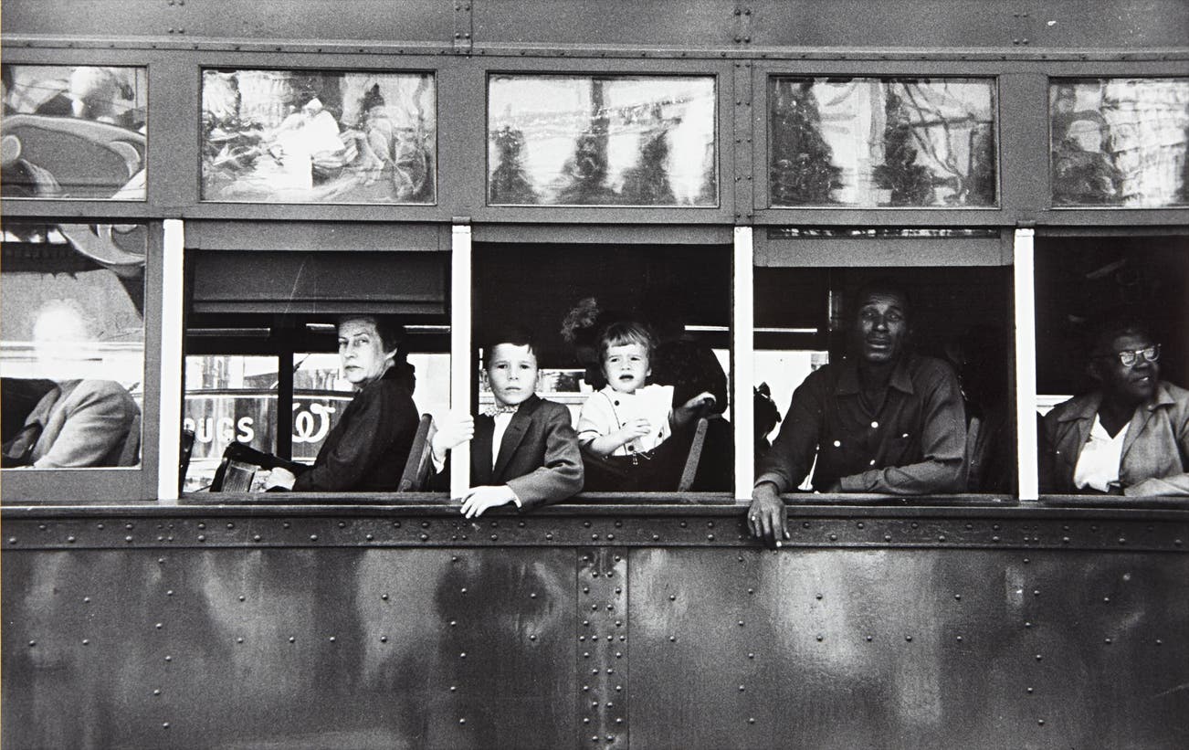 Upon his arrival in New Orleans, Frank, fascinated by the vivacious hustle-and bustle of the city, observed an ongoing parade. Compelled by nothing but a gut feeling, Frank suddenly turned his back on the staged spectacle only to behold and capture the image of a trolley passing through the French Quarter and inadvertently presenting a cross-sectional slice of the racial demographic hierarchy. The grid proffered by the trolley’s structure neatly if eerily delineated the segregation enforcement of the era, with five windows showcasing the breakdown in race, gender and age: white adult male, white adult female, white children, African-American adult male and African-American adult female. With the exception of the latter, all appear to make direct eye-contact with the photographer, and consequently, with the viewers, mustering an accordingly wide array of reactions, from stern confrontation to melancholic pleading.