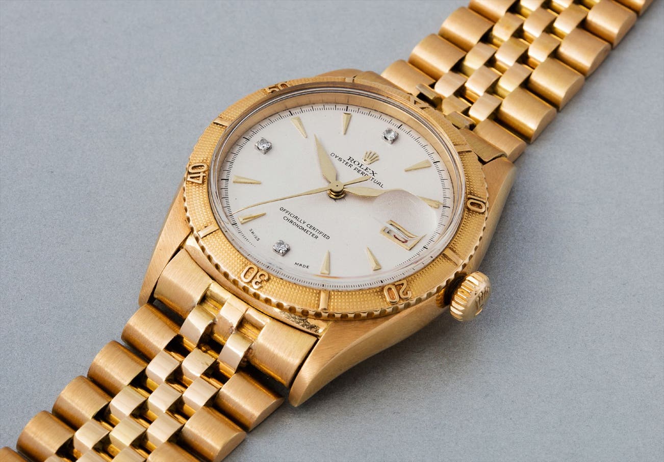 Fitted with a graduated, rotating bezel, the Turn-O-Graph was designed to measure elapsed time similar to a chronograph, without the cost of a complicated chronograph caliber. It was a revolutionary design that was quickly adopted by many brands after Rolex’s introduction. The Turn-O-Graph was essentially a Datejust model, modified to become a tool watch by the addition of the rotating bezel. The larger bezel shrunk the visible surface area of the dial, causing the original “Swiss” of the Datejust dials used to nearly disappear. On this very early example, Rolex therefore printed a second “Swiss Made” at 6 o’clock to ensure this important designation was clearly visible. The present yellow gold watch with yellow gold bracelet was at its time of production, one of the most expensive and exclusive watches produced by Rolex. The 3.54 stamped on the bracelet clasp is absolutely consistent with the case number, and when combined with its excellent overall condition, it is a superb example of a very early Datejust Turn-O-Graph model for the connoisseur.