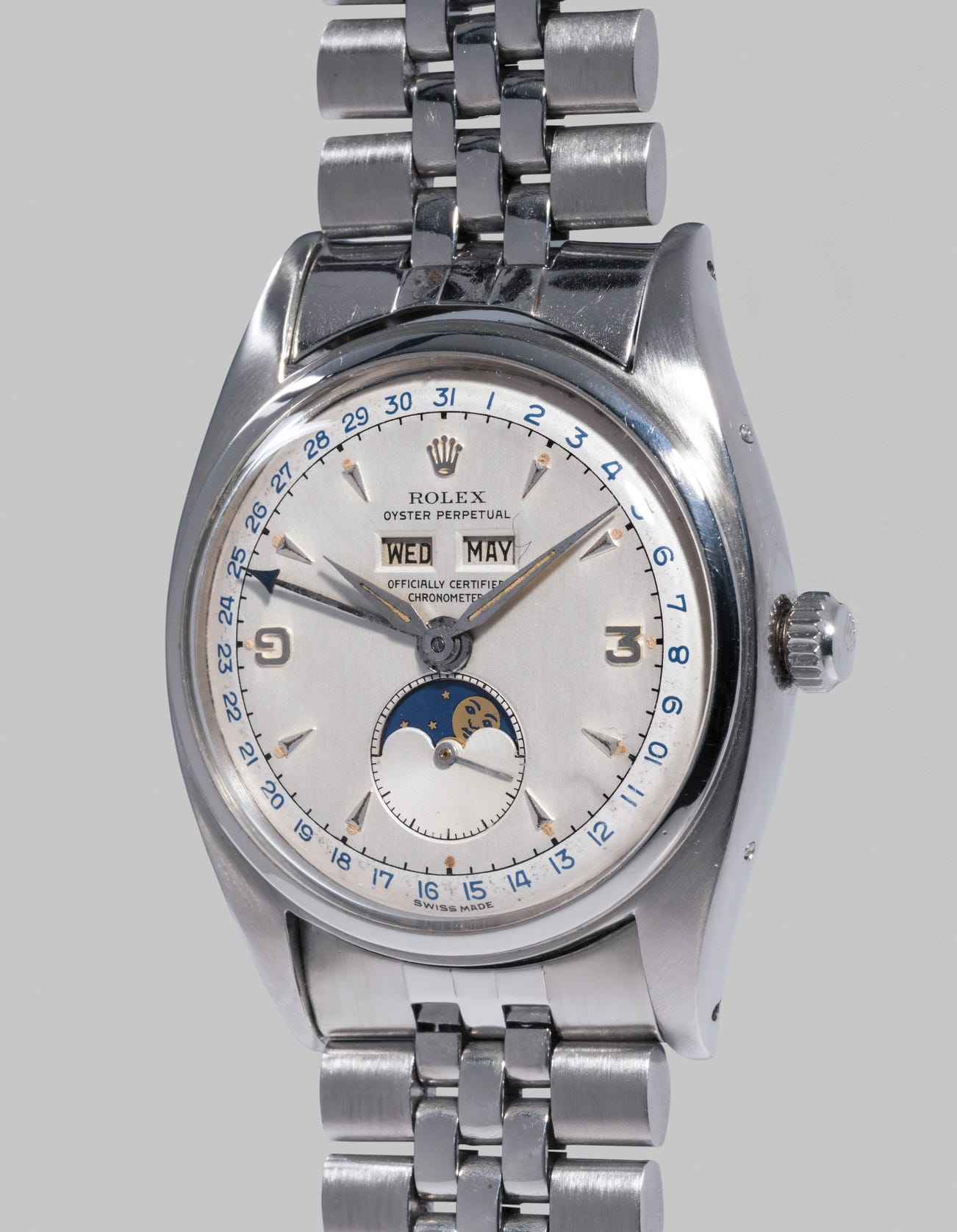 Featuring Arabic numerals at 3 and 9 o'clock, it features a lacquered silvered finish in the main portion of the dial, along with a ivory grené outer ring, providing great contrast and depth to the watch. The angled date and day apertures demonstrate the dial's originality, along with the sharp track where the moonphase aperture meets the rim of the subsidiary dial. The luminous material is placed exactly where it should be - precisely outside the silver-colored facetted relief hour markers and next to the Arabic numerals, reflecting Rolex's extremely stringent standards in quality. The outer date ring, too, is correct. The printing displays an inky blue hue which one would expect on an original example. The font is correct, with characteristic "open 6 and 9s". Considering the watch is over sixty years of age, it is remarkable that the dial has not been spotted or tarnished. This example remains free of noticeable imperfections in part to its waterproof Oyster case that still bears "Modele Depose" and "Registered Design" on the case back, interspersed with a curved rectangular design.