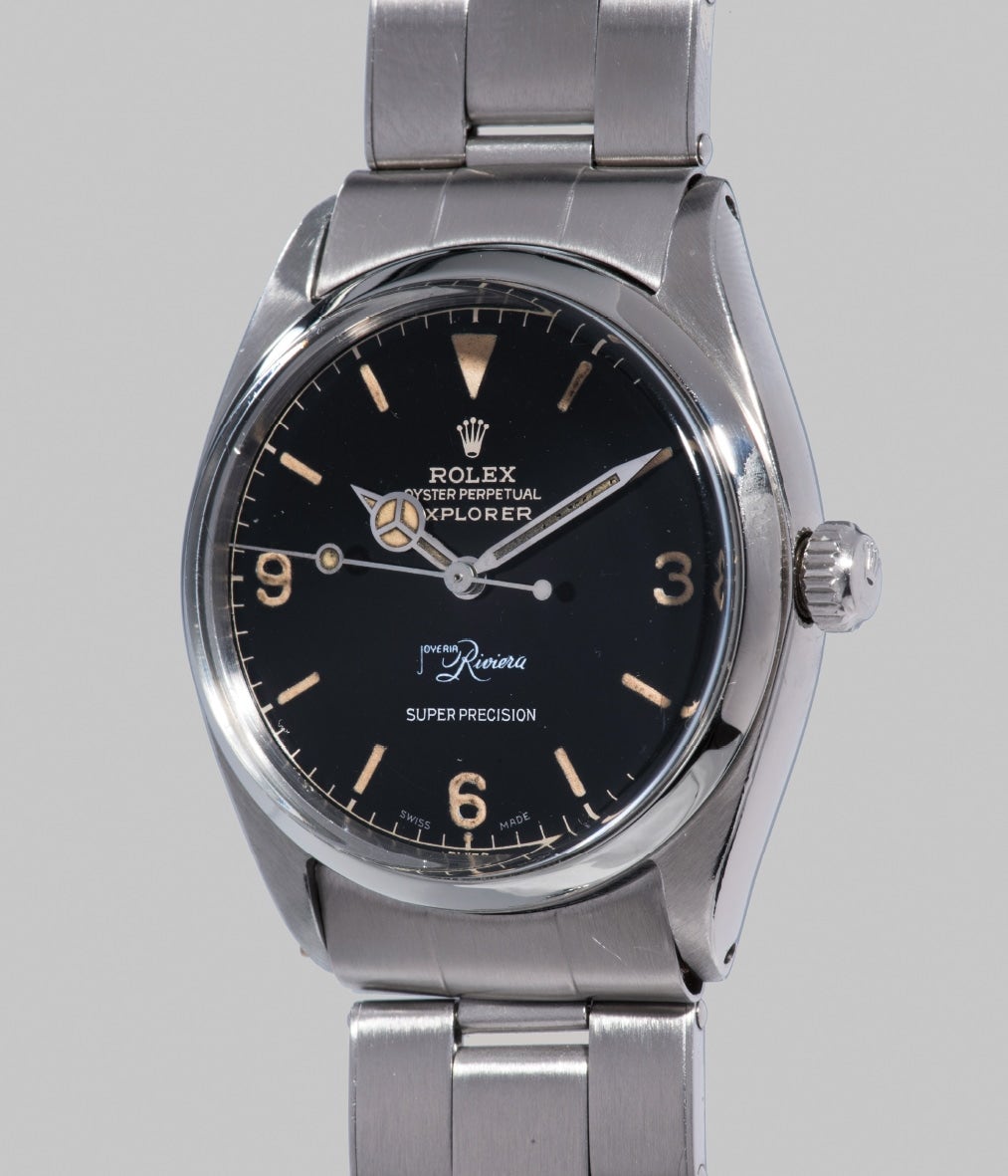 The present lot is an interesting and uncommon example of the Explorer, with a beautiful dial and uncommon Joyeria Riviera signature, offering great value for fans of vintage Rolex sports models.