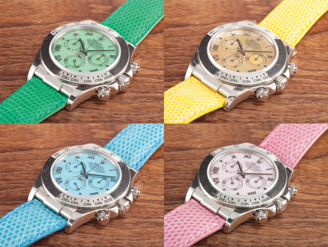 Cosmographs from the Beach series are fitted with hard stone dials (yellow mother of pearl, green chalcedony, pink mother of pearl and turquoise) and, already today, rare collector’s watches.