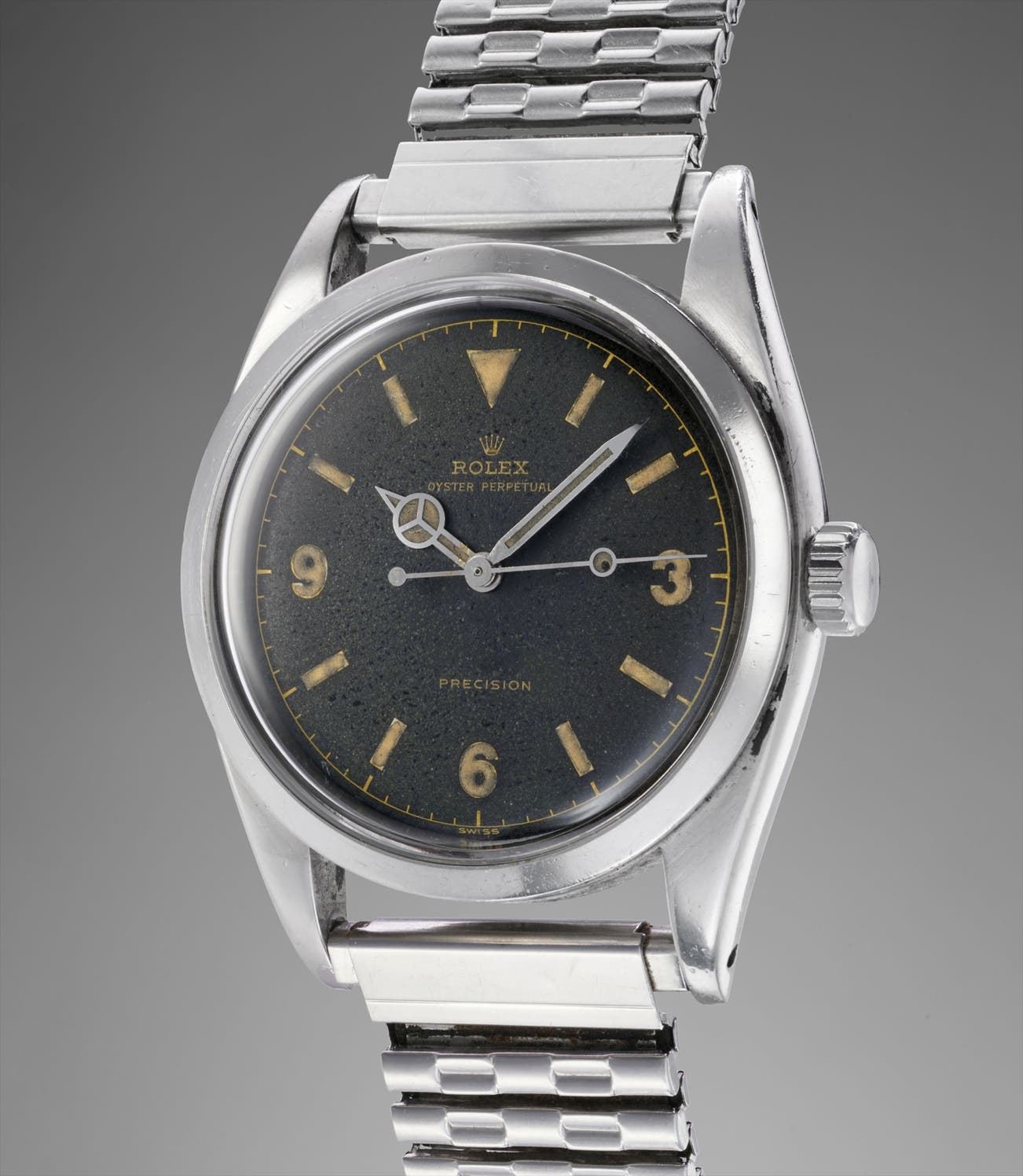 An attractive and historically important wristwatch with centre, seconds, black lacquer "explorer" dial and bracelet, worn on the 1955 Kanchenjunga Expedition by George Band