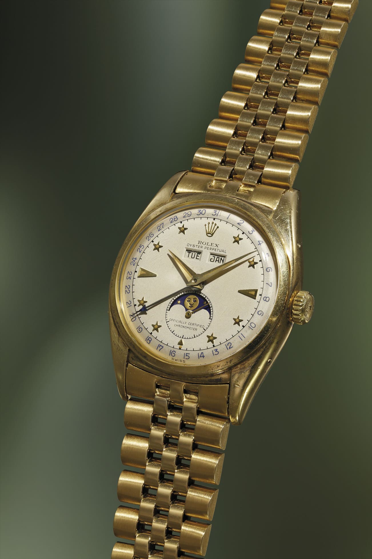 Reference 6062 is one of two Rolex models to feature a triple calendar complication paired with a moon phase indication. While reference 6062 features a screw down Oyster case back, reference 8171 features a snap-on case back.