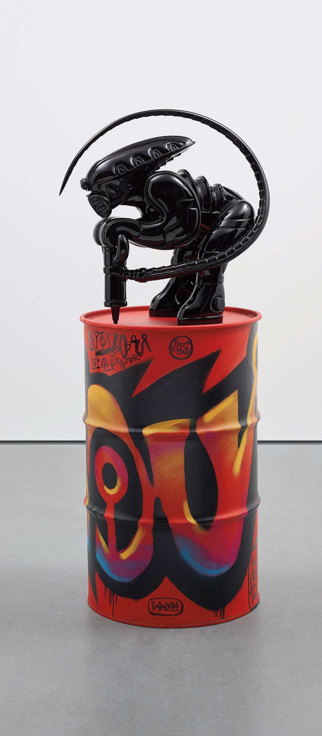 titled and numbered '"human alien" 1/15' on the underside of the alien; further signed 'minin' on the metal barrel
