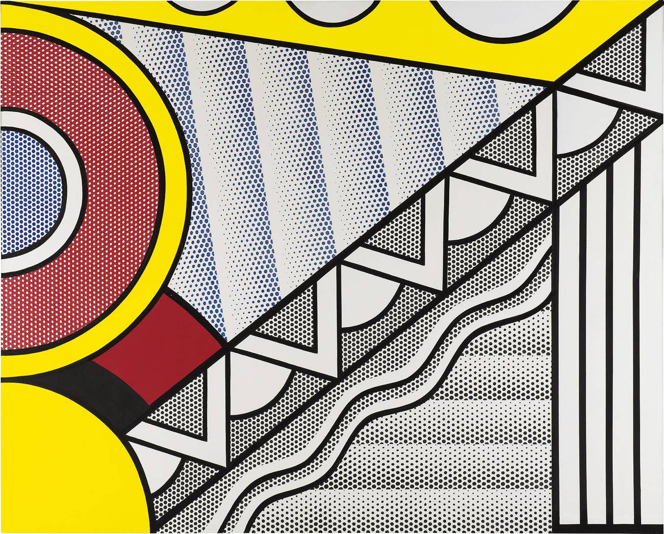 It was in the summer of 1966 that Lichtenstein inaugurated his engagement with Art Deco. While still working on his Brushstrokes series, the artist was commissioned to design a poster for New York City's Lincoln Center. For his subject he turned to the architecture and design of the 1920s and 1930s which was plentiful in the streets of midtown Manhattan. The following year he was commissioned to create a mural for the American Painting Now exhibition at the U.S Pavilion in Montreal. In Modern Painting for Expo 67 Lichtenstein created one of his largest murals and featured the graduated Ben-Day dots that we see replicated in the present work, also executed in 1967. Concurrent with Lichtenstein’s first European retrospective at the Stedelijk Museum in Amsterdam, this year signified the continued diversification of his subject matter as he reached an increasingly international audience.