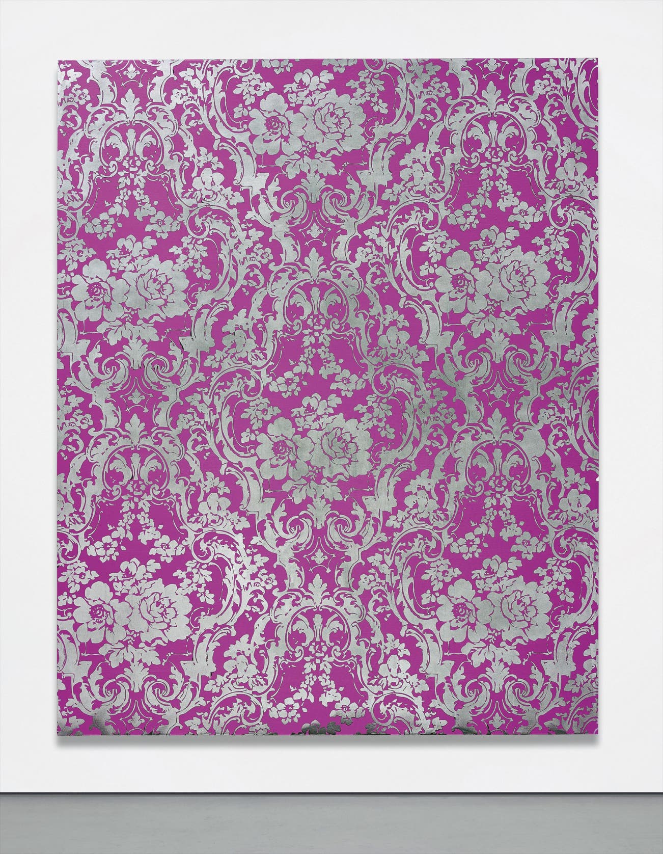 Rudolf Stingel’s fascinating Untitled asserts itself as one of the latest examples of the artist’s eagerly sought-after series of carpet works and a shimmering exploration of space, pattern and texture. Almost immediately, one is immersed into the unpredictable and uncertain surface of the canvas, as delicate ornamentation melts into geometrically-guided repetition. Swirling imprints and lively vines dominate the ornate textile relief, pierced by small and unique deviations, leaving room for a sense of painterly accident. These deviations provide an indelible trace of their human craftsmanship. Amidst the brilliance of the magenta hue and iridescent silver, imprints of medallions and floral motifs emerge, evoking the Baroque tapestries that inspired Stingel. The intricate craftsmanship associated with both the Baroque and Rococo is something Stingel personally experienced and even undertook growing up in the Italian Tyrol and Vienna, where he attended a high school that provided training in Baroque decorative church wood carving. The materiality of such work left a deep impression on the young artist, conferring upon him a deep appreciation for the richness of decoration and the synthesis of both pictorial and architectural space.