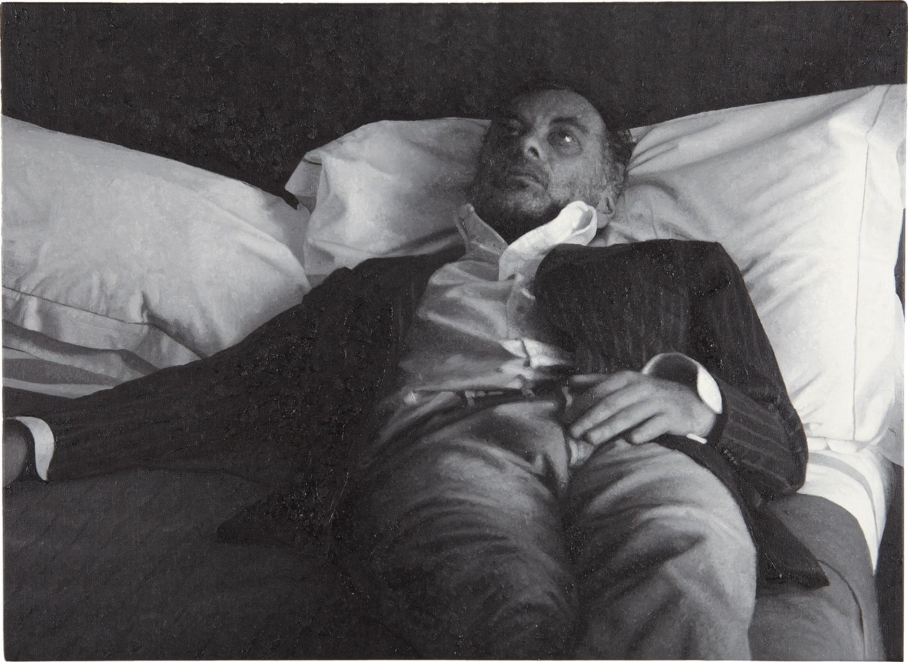 World-weary, a crumpled Stingel lies on a hotel bed, still wearing a pinstripe suit jacket and gazing, listlessly, up at the ceiling and beyond the picture plane. Melancholic yet immobilised, the image exudes a sense of action immediately passed or just outside of the frame, tantalisingly close but unavailable to the viewer. In its dramatic foreshortening and corporeal compression, his position recalls the perspective distortions of Andrea Mantegna’s enigmatic depiction of the supine body of Christ, The Lamentation over Dead Christ, c.1483. Stingel appears worn out by the weight of his artistic forebears – and in the words of Francesco Bonami, curator of Stingel’s 2007 retrospective at the Museum of Contemporary Art Chicago, ‘the weight of art history, the weight of generations of painters asking the same question and never finding the right answer, the responsibility to be in charge of Painting, maybe for the last time, maybe and more tragically, forever’ (Francesco Bonami, ‘Paintings of Painting for Paintings,’ in Rudolf Stingel, exh. cat., Museum of Contemporary Art Chicago, Chicago, 2007, p. 20). Notable here is how this exaggerated description of the exulted status of painting and by extension, that of painters themselves, functions in direct contradistinction to the rallying cries of the death of the medium that accompanied the beginning of Stingel’s career. Mobilising photography’s innate ability to capture themes of memory, time and mortality as infiltrator, his work exacerbates the underlying conceptual rigour of painting in the 21st century.