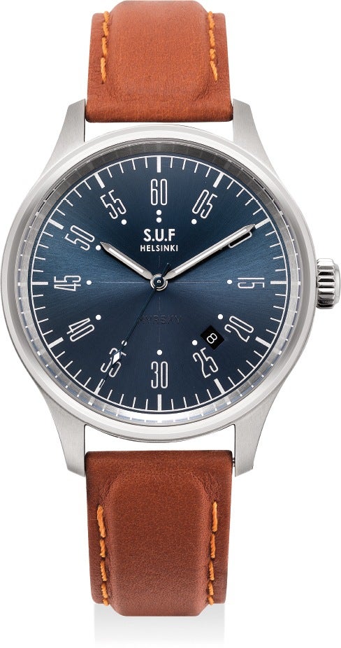 Embodying the spirit of sisu, a uniquely Finnish cultural conception and collective identity typified by a distinct “strength of will, determination, perseverance, and acting rationally in the face of adversity,” S.U.F. Helsinki was founded by Stepan Sarpaneva as a more rugged complement to his namesake brand. The present watch, featuring a sunburst blue dial, date window between four and five o’clock, and signature elongated Arabic numerals, is a limited edition Mysrky model with an illustrated sapphire caseback depicting the Moomin character ‘The Groke’.