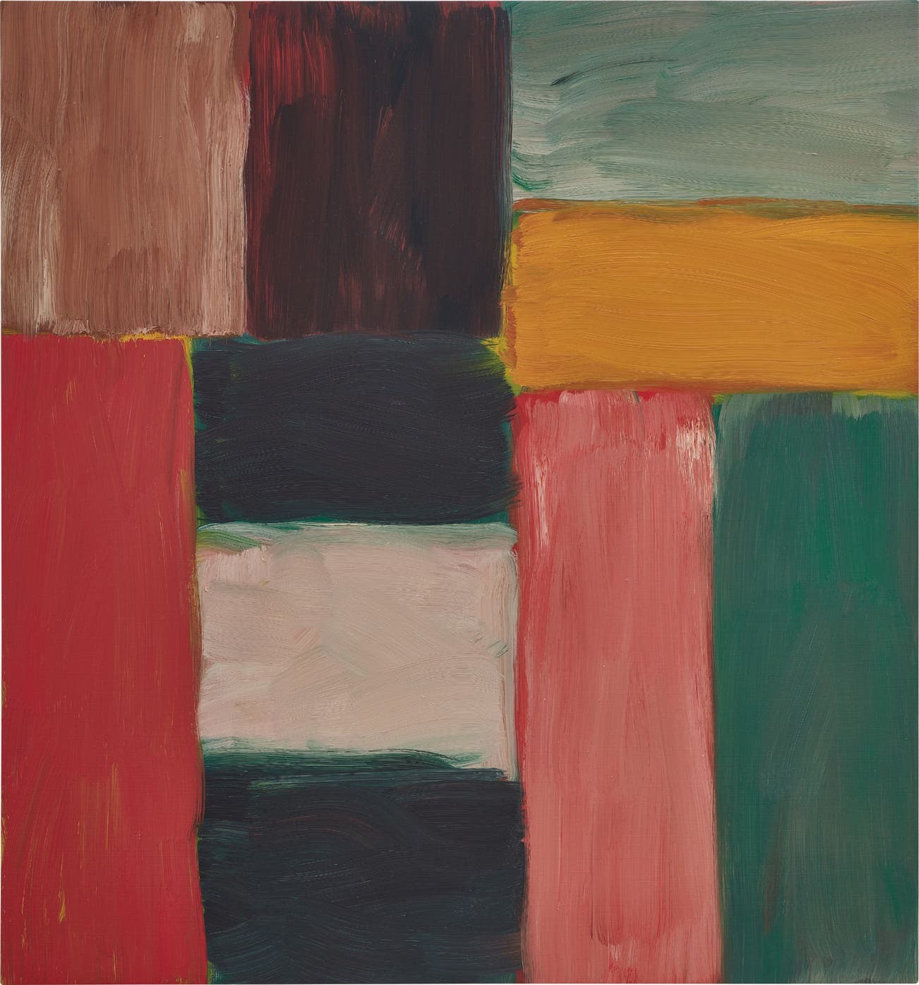 From early in his artistic career, Scully had been painting in a grid-like format, focusing on the horizontal and the vertical as universal elements, common visual denominators, originally fusing ideas from Abstract Expressionism with an aesthetic that recalled Minimalism. The experiences Scully encountered in Mexico helped push his paintings further from Minimalism, towards a more evocative, lyrical realm. This is clearly in evidence in Wall of Light Green, both in its palette and its application, with the various forms creating an arresting visual rhythm. Scully has deliberately avoided symmetry or an over-reliance on regularity to create a painting in which the blocks of colour are held together with a vivid, vital tension. The horizontal and vertical bars of colour serve as a formal architecture, a common denominator, upon which he is able to build his own subjective and ultimately expressive vision.