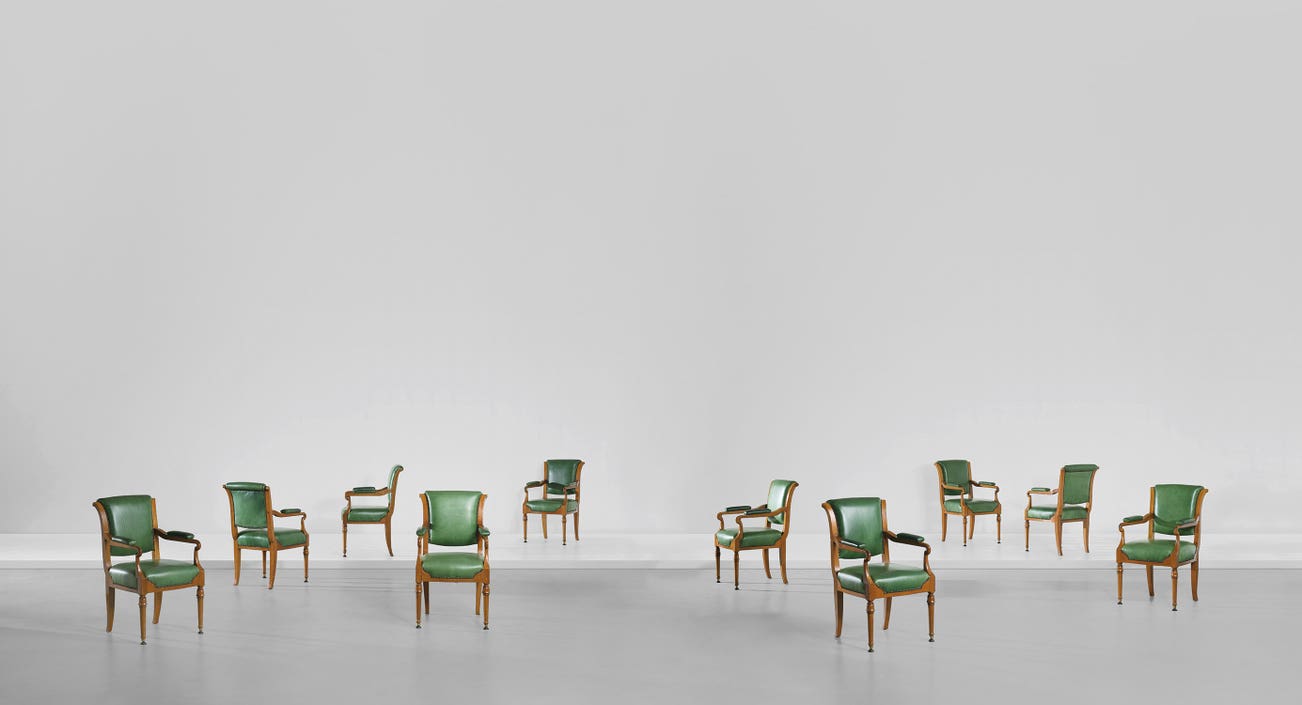 The present ten chairs comprising lot 74, formed part of a set of furniture designed by Lutyens for the boardroom at the Midland Bank Poultry headquarters. The set also included the elliptical and rectangular tables, also designed by Lutyens and more fully described in lot 75. Lutyens first experimented with modular furniture in Marsh Court (1901–1905) where his design for the dining room table comprised of two D‐ends with free standing inserts. Marsh Court was in fact one of the very first buildings that Lutyens furnished with his own designs for furniture and lighting. Apart from his own family use, Lutyens appears not to have used his own designs much until his great work in New Delhi (completed 1935), his great office buildings, Britannic House in Finsbury Circus, the Midland Bank buildings, London and the one in Manchester, and smaller office buildings such as 120 Pall Mall.