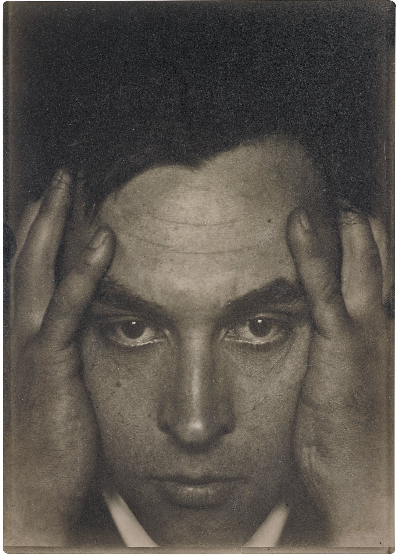In this self-portrait, Witkacy has cropped the edges of the frame along his hands, which rest on either side of his face. His dark hair disappears into the background, removing any spatial awareness from the composition and focusing the viewer on the eyes of the artist. Although Witkacy never regarded himself as a photographer nor exhibited his photographic output, photography played an important role in the life and creative practice of this eccentric genius.